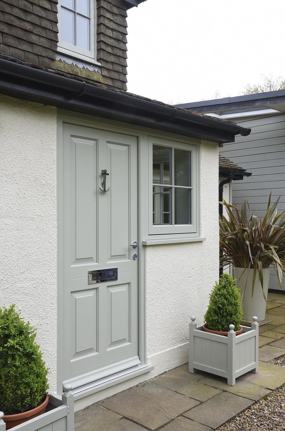 French Grey flush casement windows were chosen throughout. Single entrance doors include a traditional Bevington, a contemporary Miniver were selected in French Grey, along with a Staverton in Off-White as an internal porch door.