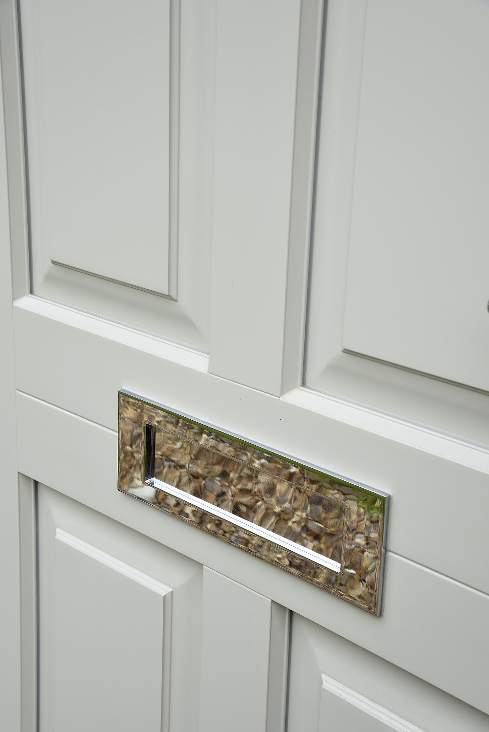 Bevington entrance door finished in 'French Grey' with Samuel Heath Chrome Plated medium sized letter plate. Manufactured in Engineered European Redwood.