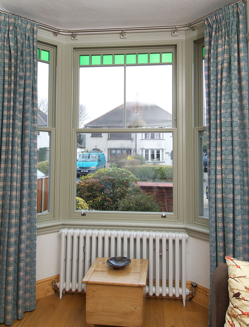 Timber sash windows were updated in this home whilst replicating the intricate upper design area and coloured glass sections, as well as a fine vertical glazing bar to the upper sash. The frames were given a subtle but modern twist, finished in a contemporary shade of French Grey. Minimal, fine glazing bars allow the large expanses of glass to fill the rooms with natural light whilst energy efficient double glazing ensures that heat doesn’t escape at colder times.