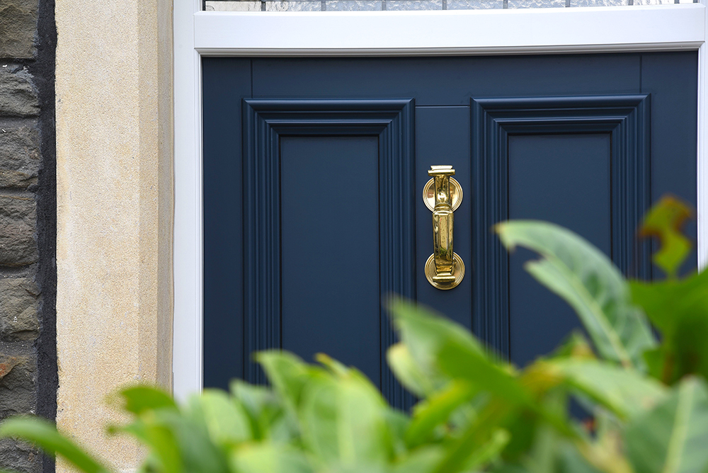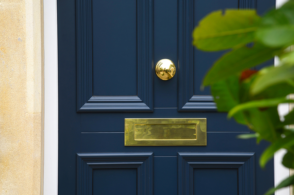 After taking inspiration from his neighbours, Mr Mein specified a stunning new Bevington entrance door in a ‘Harewood Grey’ finish for his home. This features traditional ‘bolection’ style mouldings on the panels, as well as Polished Brass ironmongery, including a large Doctor’s knocker and a Medium sized letter plate from Samuel Heath.
