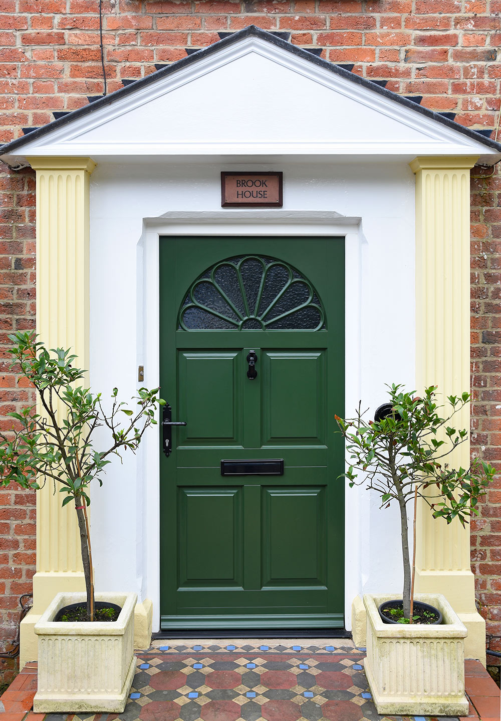 The front door is a beautiful Chadlington design with bespoke arched astragal bars, finished in a classic and elegant green shade known as ‘Fortnum’ combined with a ‘White’ frame and set off with black ironmongery. The rear entrance door is the Rawlinson design in a colourway to match the front door.