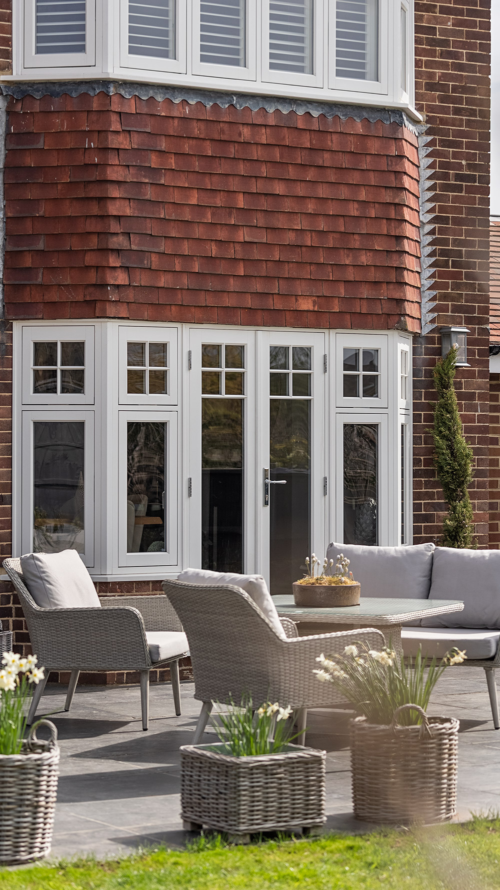 French doors and flush casement windows, finished in ‘Off-White’, with 18mm astragal glazing bars. Manufactured in Engineered European Redwood.