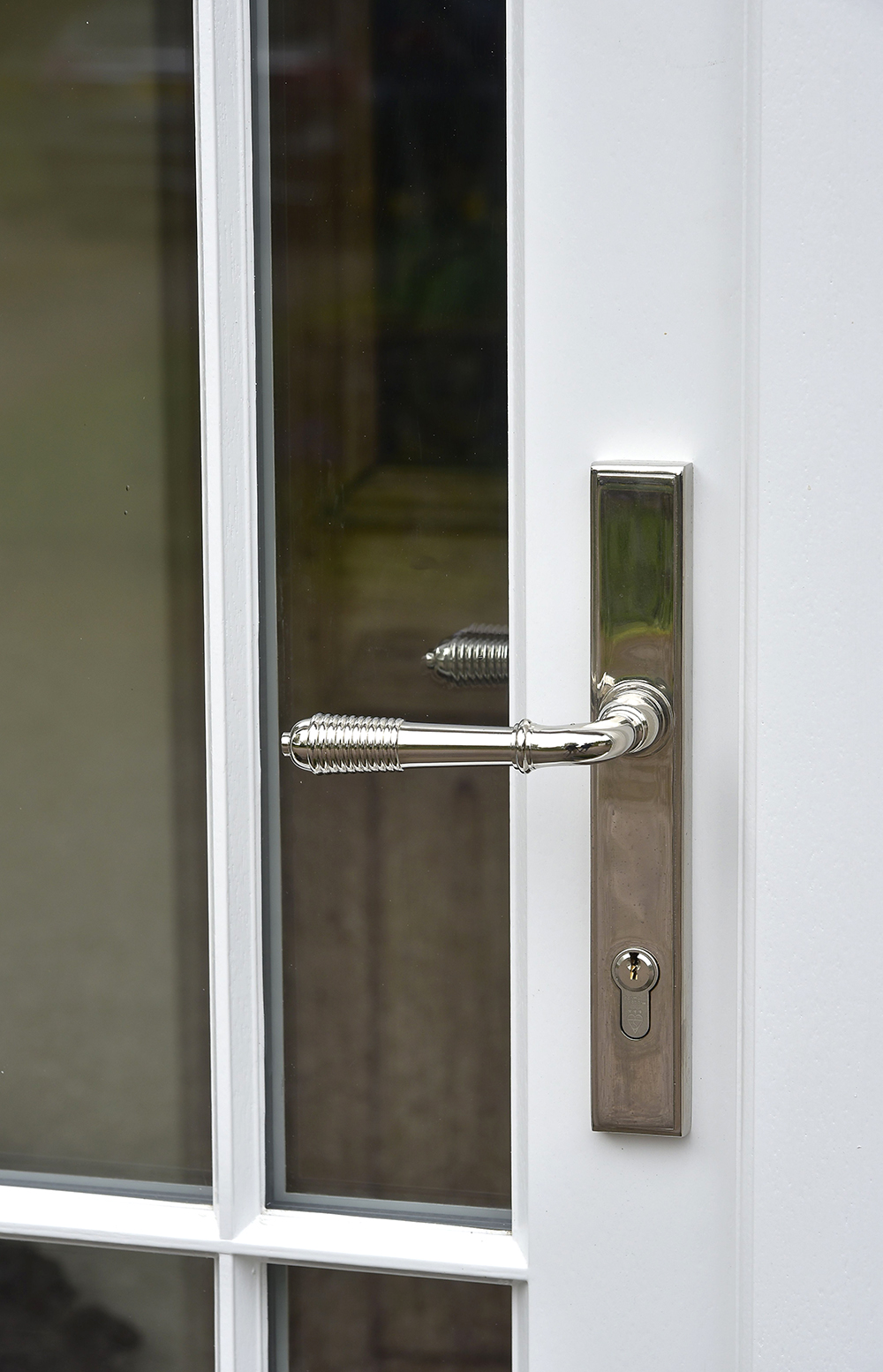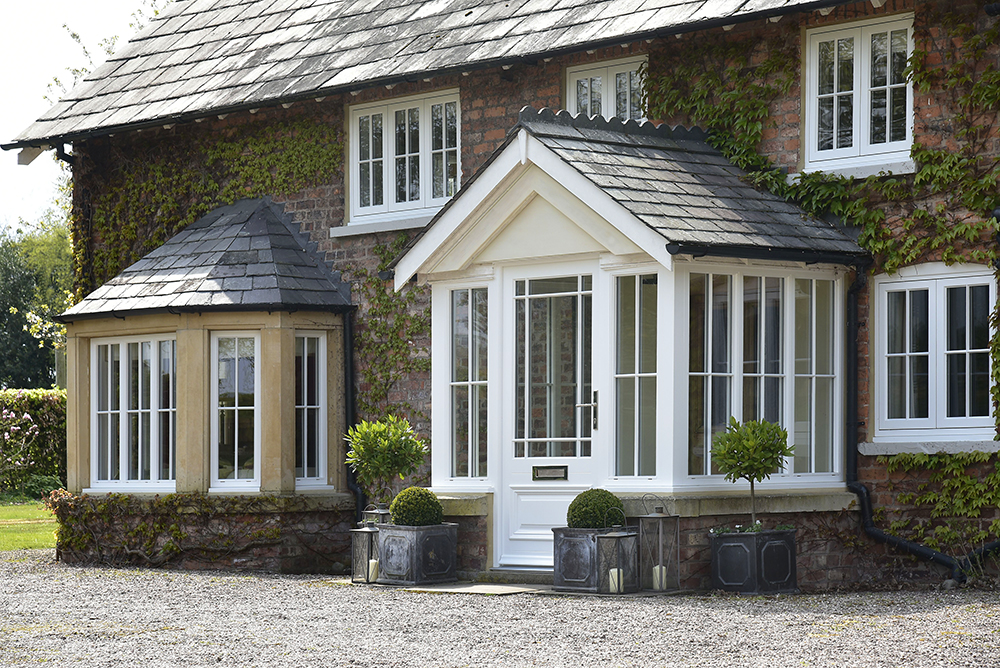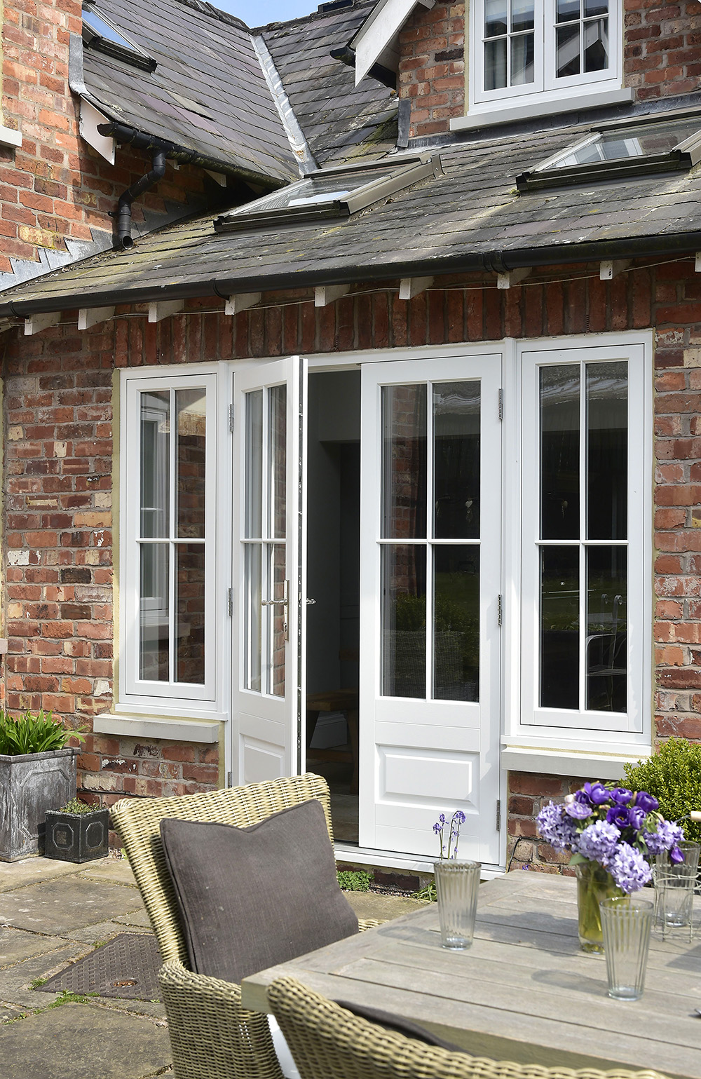 Bespoke Bardwell entrance door and Cottage casement windows finished in ‘White’, featuring 18mm horizontal astragal glazing bars, in Engineered Meranti hardwood.