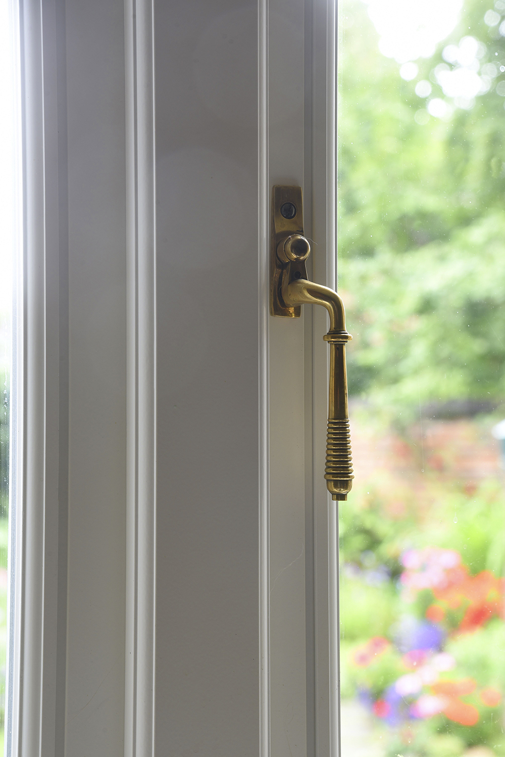 The Aged Brass Reeded handles add a touch of simple elegance to the white painted interior faces of the windows.