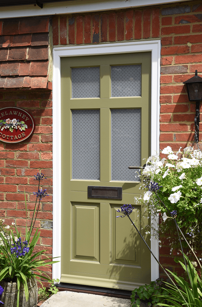Frenchay entrance door finished in 'Verdi' with Etched Star glass and Bronze Extended Contour handle from Samuel Heath