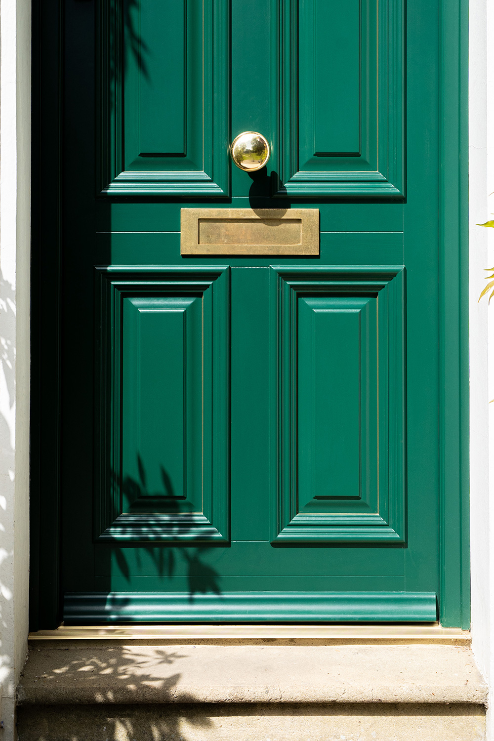 Bevington door design with toplight, finished in ‘Moss Green’ featuring Polished Brass hardware from Samuel Heath.