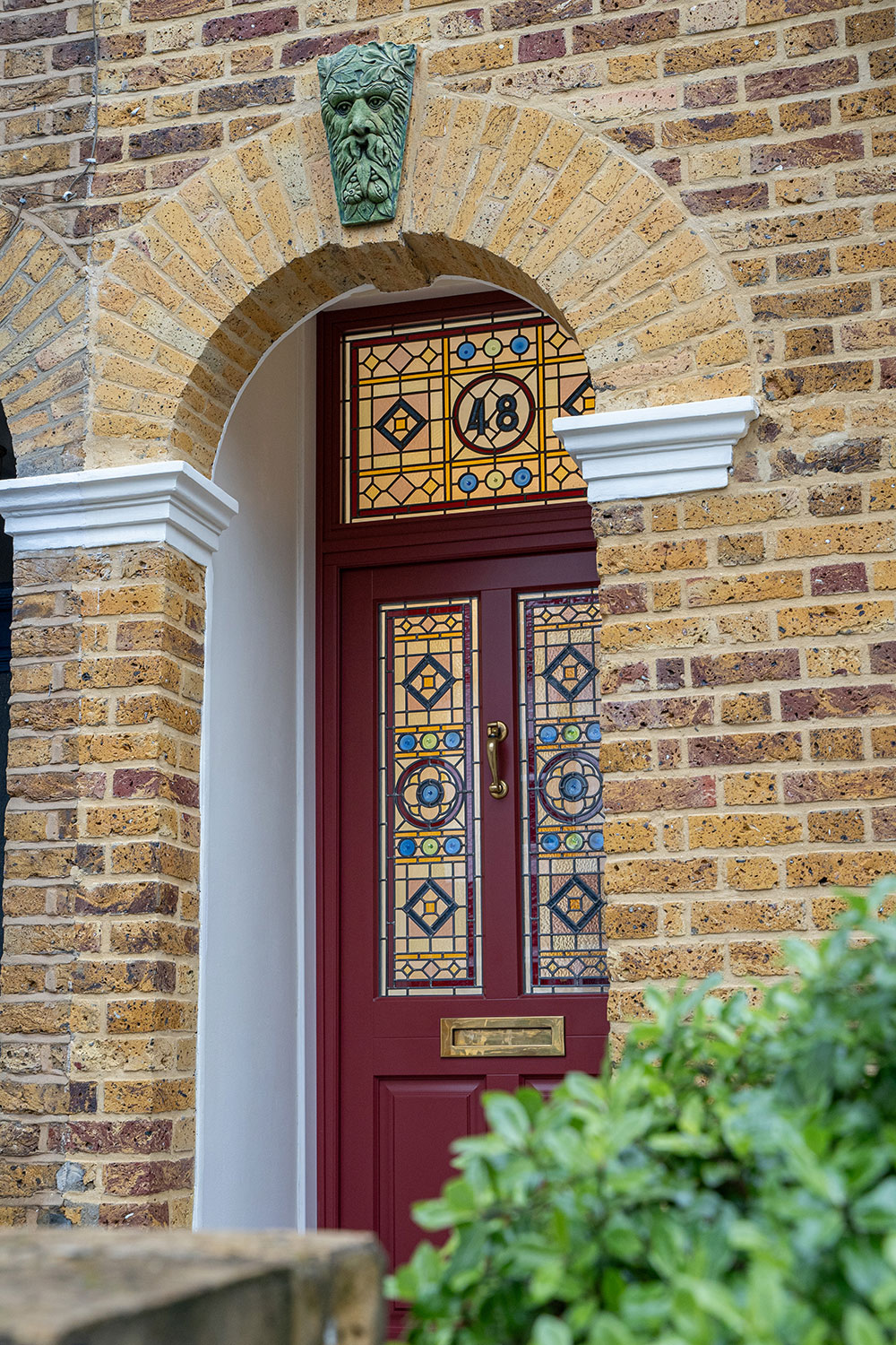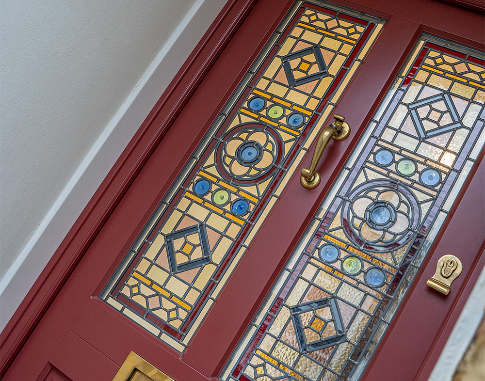 The stunning Kingston door with toplight has been finished in a shade complementary to Farrow & Ball “Eating Room Red” with Aged Brass hardware and bespoke, hand-crafted stained glass.