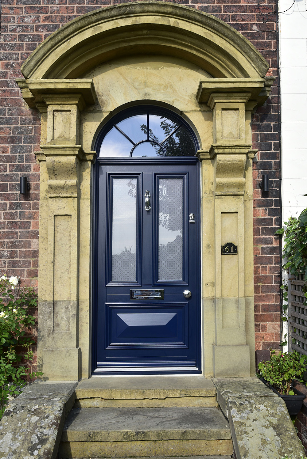 A spectacular Westonbirt door with a sunburst design toplight now adorns the ornate stone entrance way, finished in Oxford Blue with polished chrome ironmongery.