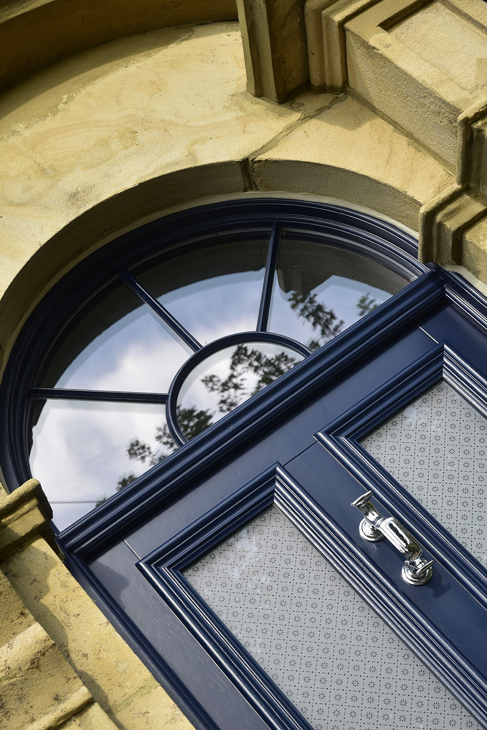 A spectacular Westonbirt door with a sunburst design toplight now adorns the ornate stone entrance way, finished in Oxford Blue with polished chrome ironmongery.