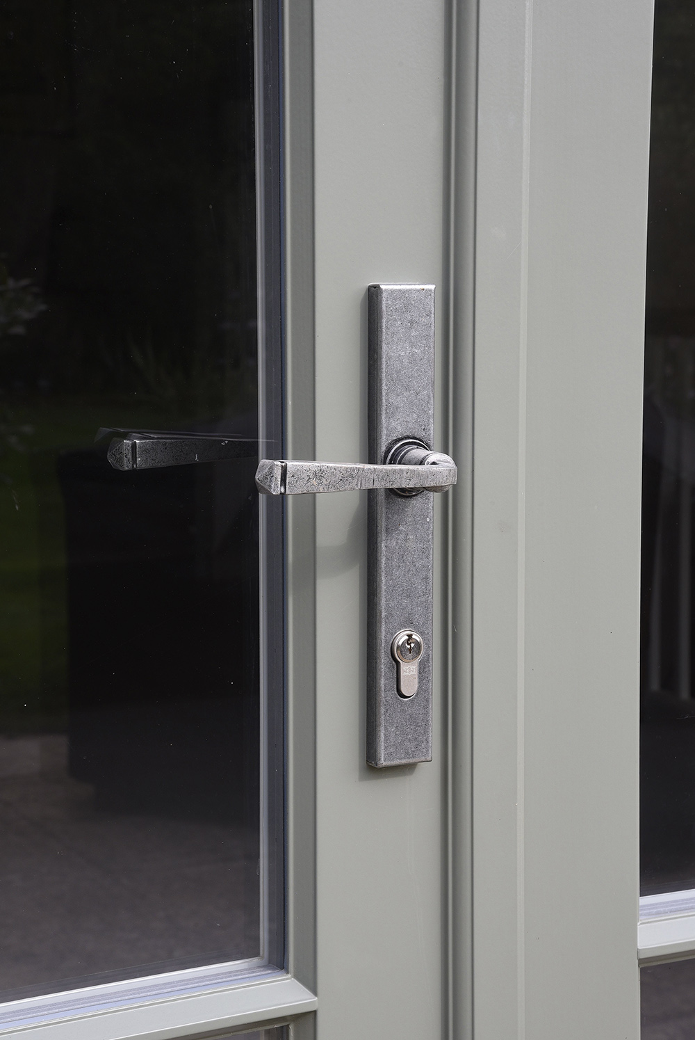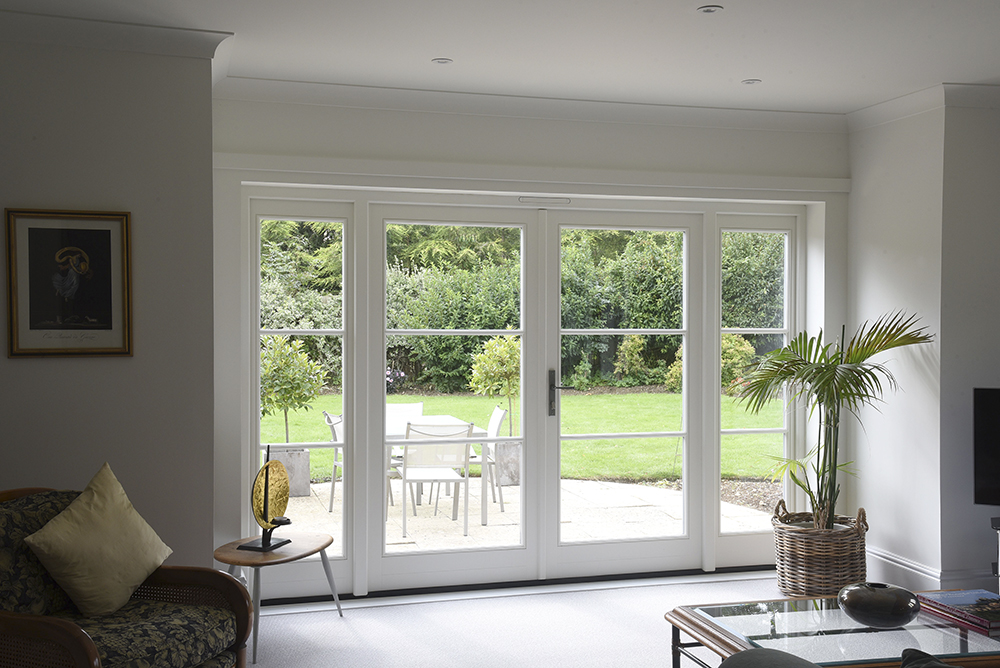 French doors with sidelights finished internally in ‘Off-White’ featuring 18mm astragal glazing bars and Pewter Avon handle. Manufactured in Engineered European Redwood.