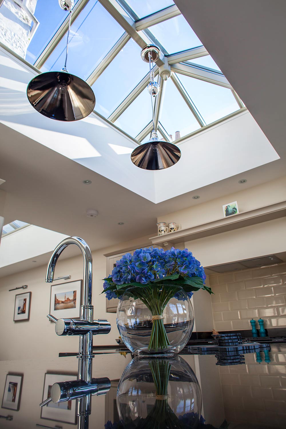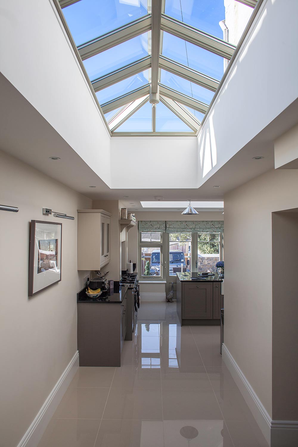 The pair of roof lanterns provides a flood of light from above to both the kitchen and hallway, creating a beautiful, airy space throughout.