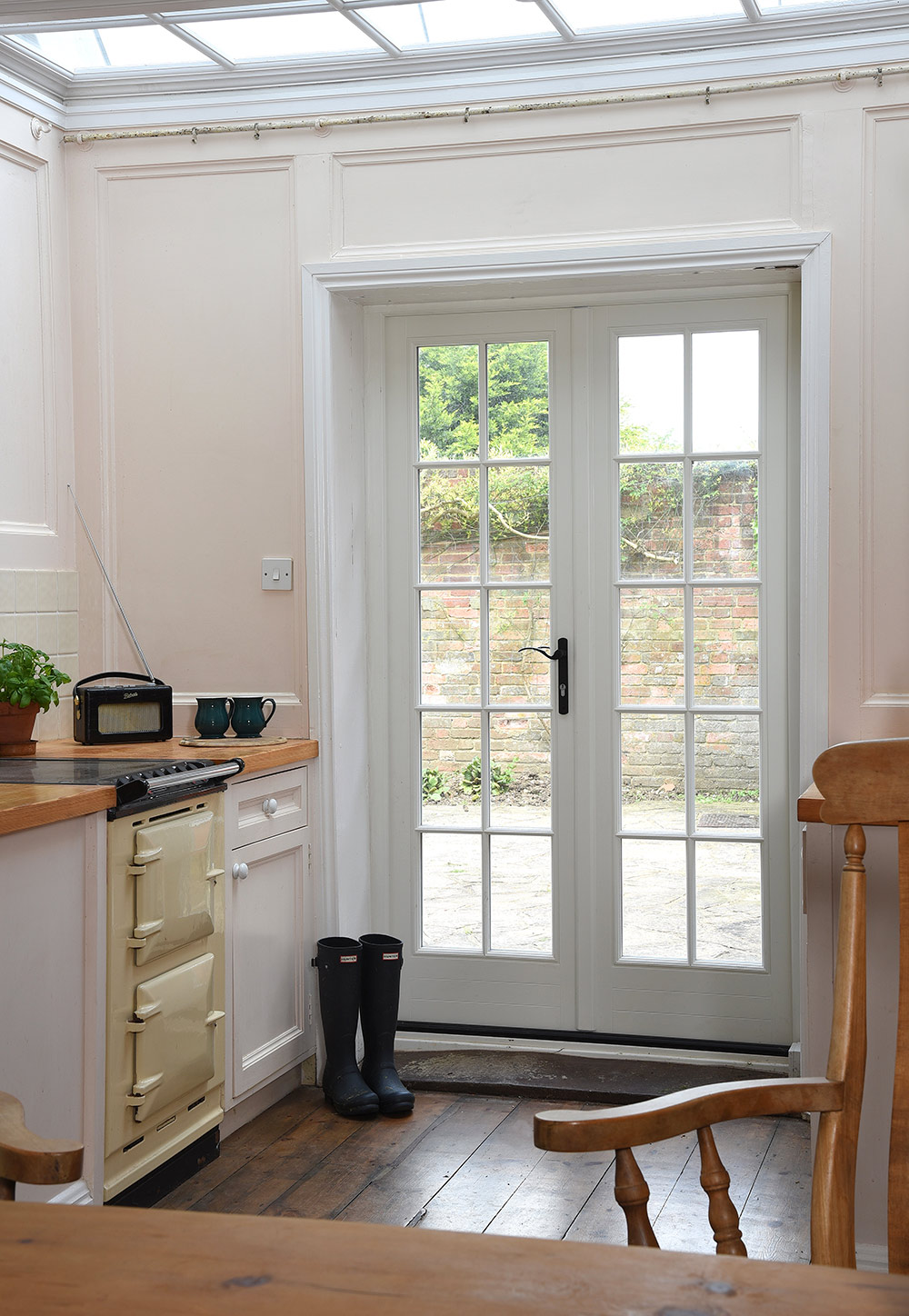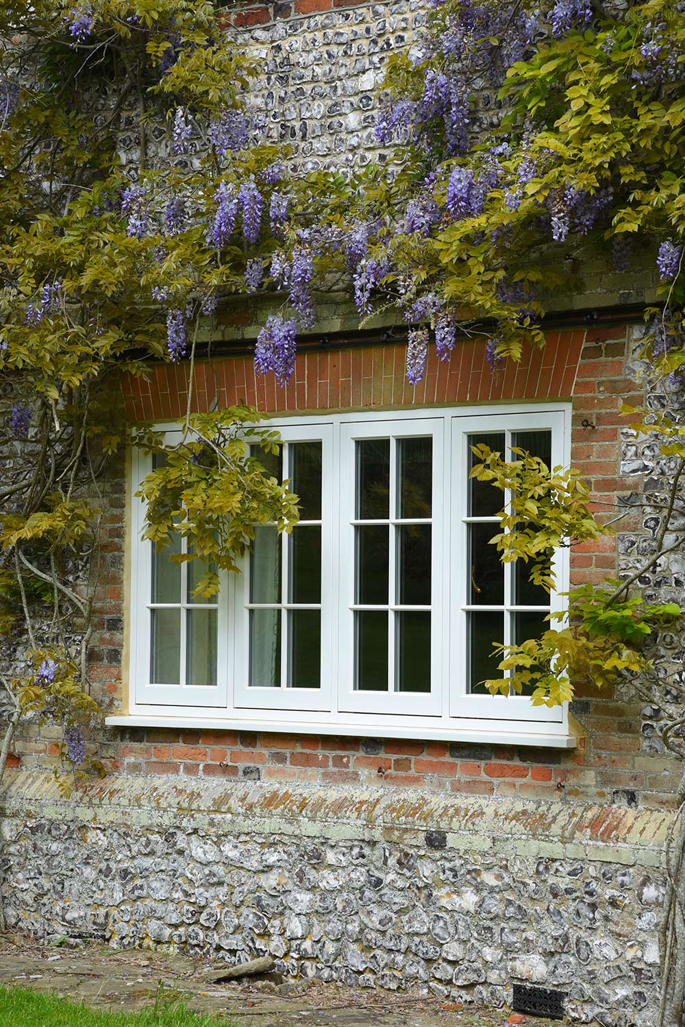 In total, 49 windows and doors have been fitted including flush casements, a circular window, French doors and an entrance door, all finished in Off White. The magnificent arched solid wood door remains in its rightful place.