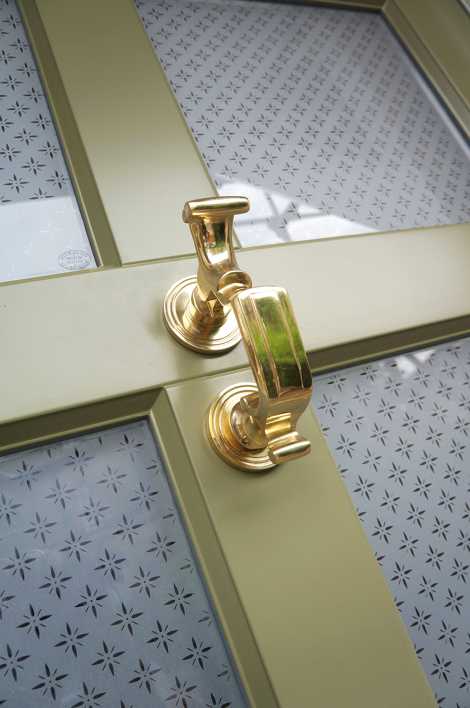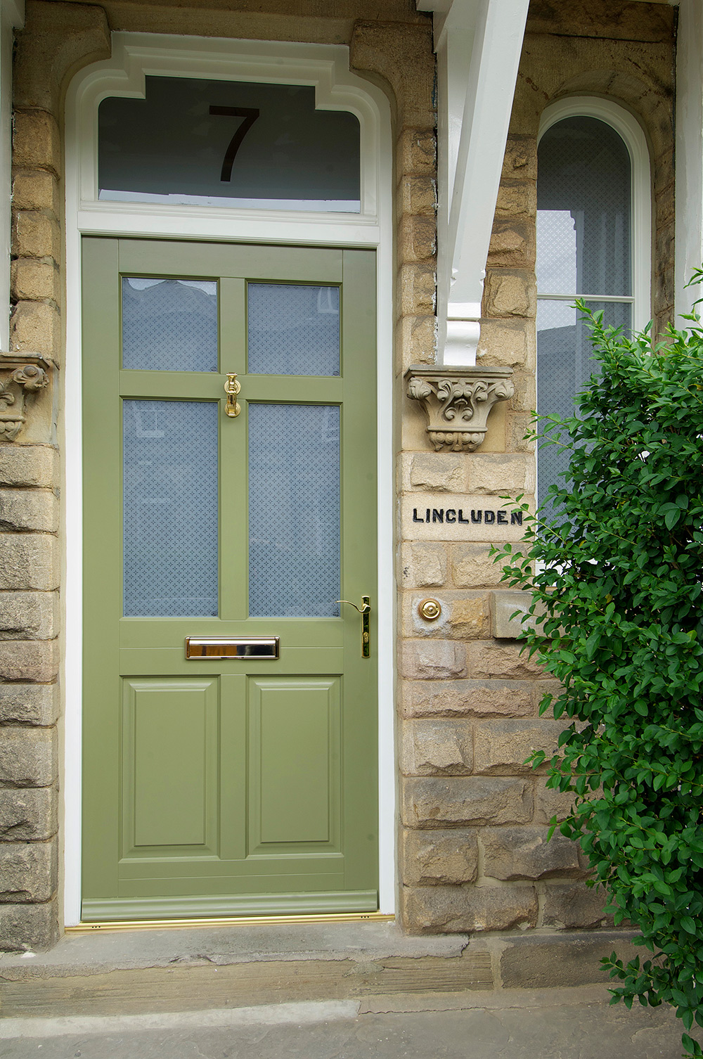 The Frenchay door has been customised to suit their wishes, with the door sash finished in the shade of Verdi and the frame, a complementary shade of Off-White. The door glazing is the beautifully intricate Etched Star pattern, while the top light glazing is sand blasted carrying a reversed out house number. To complete the look, brass ironmongery options have been fitted.