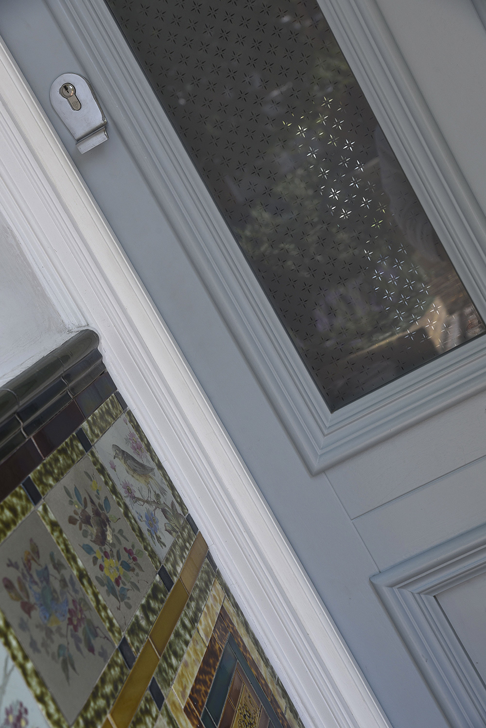The Westonbirt door is reflective of authentic Victorian design with ornate mouldings and details. Finished in a shade complementary to Fired Earth ‘Smoke Blue’ with a White frame, it’s a calming combination. Etched Star glass and Polished Chrome ironmongery are among the finishing details.