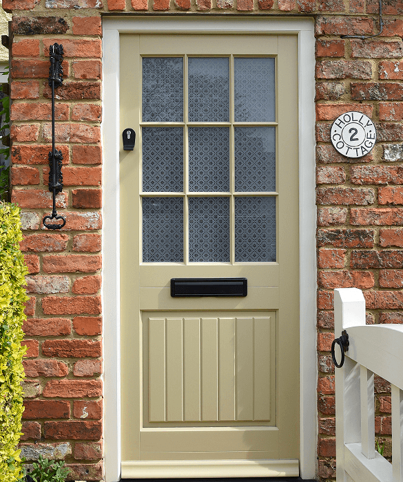 Flush casement windows finished in 'Straw', with 18mm astragal glazing bars and manufactured in Engineered European Redwood.