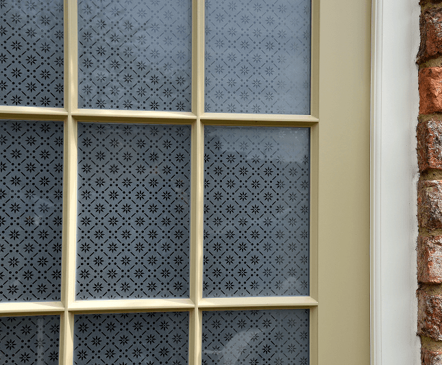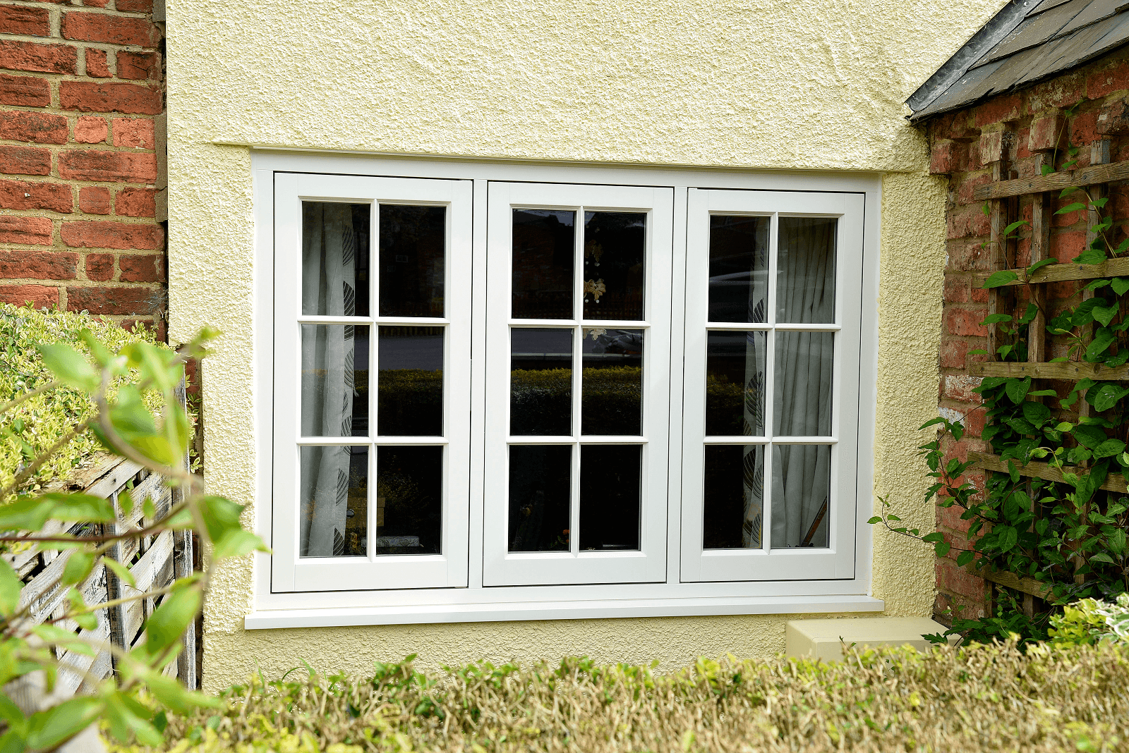 Flush casement windows finished in 'Straw', with 18mm astragal glazing bars and manufactured in Engineered European Redwood.
