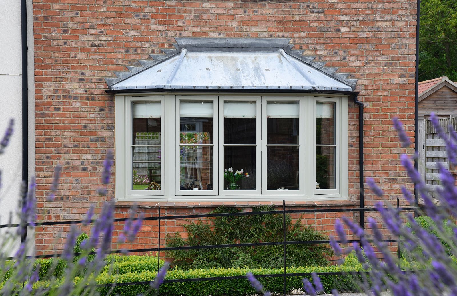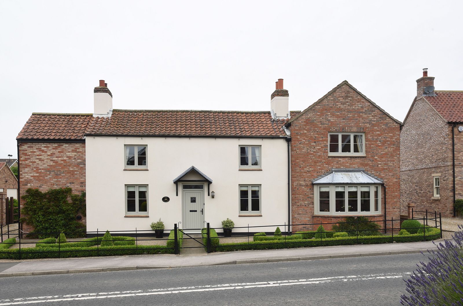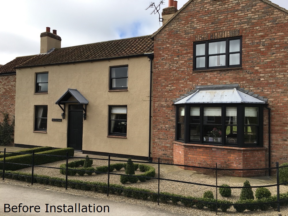 The homeowners opted for Cottage Flush Casements in order to suit the property, and to have change from what had been in place. They chose a French Grey finish with 18mm astragal glazing bars. The Staverton entrance door has the same colour finish, and is detailed with black ironmongery and leaded glass.