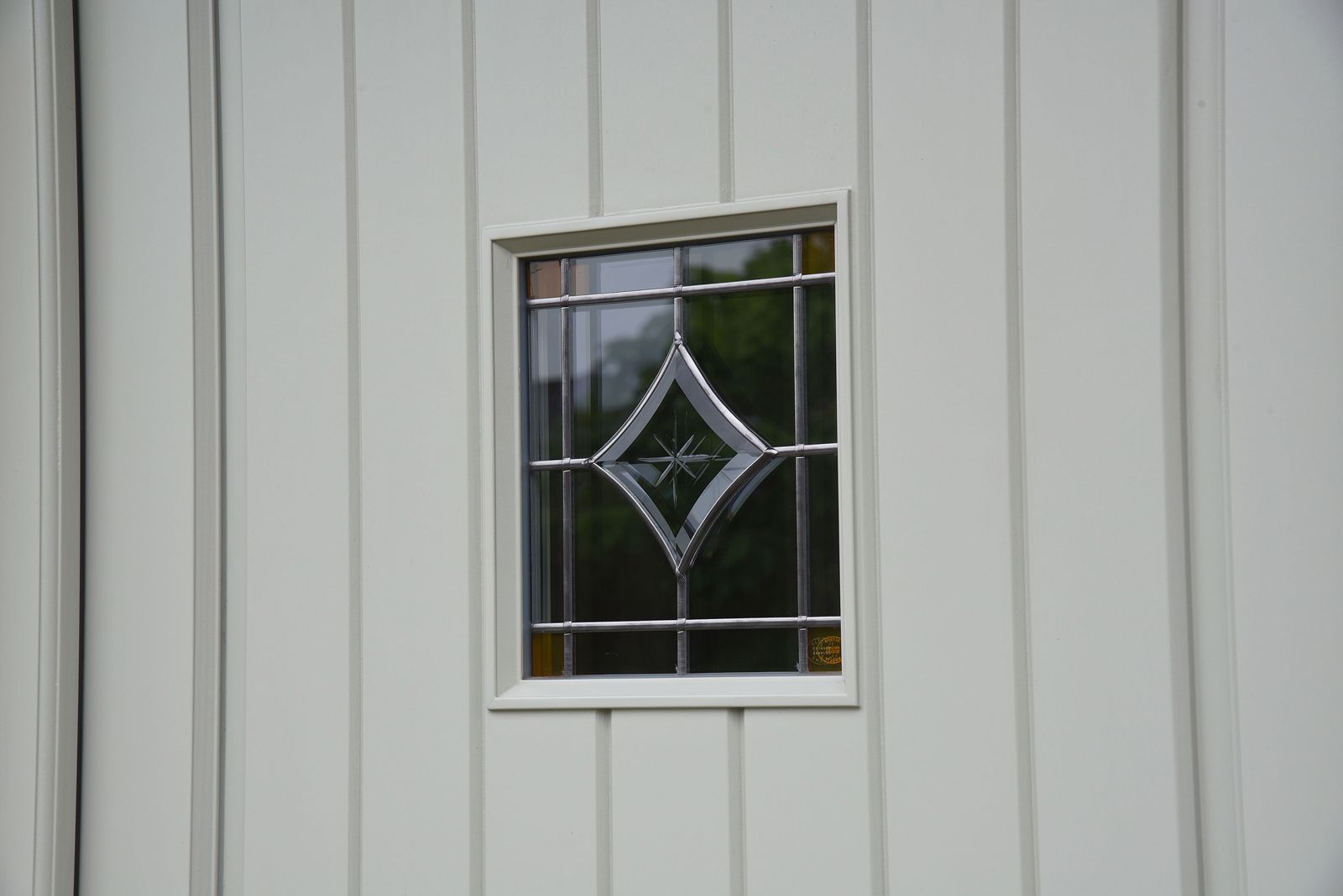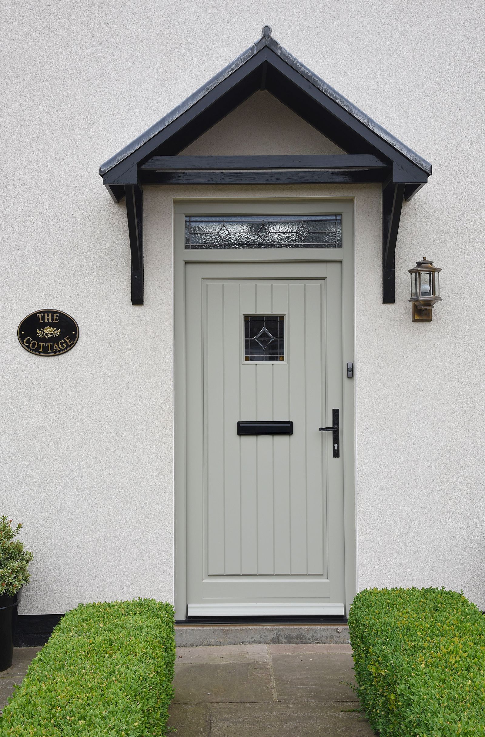 Staverton entrance door in French Grey with Bevel Amber glass to the door and Queen Anne leaded glass design on a Kathedral background to the toplight. Ironmongery options are Antique Black handle and letter plate.