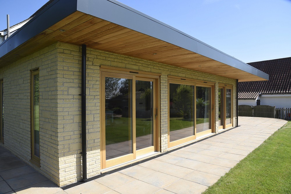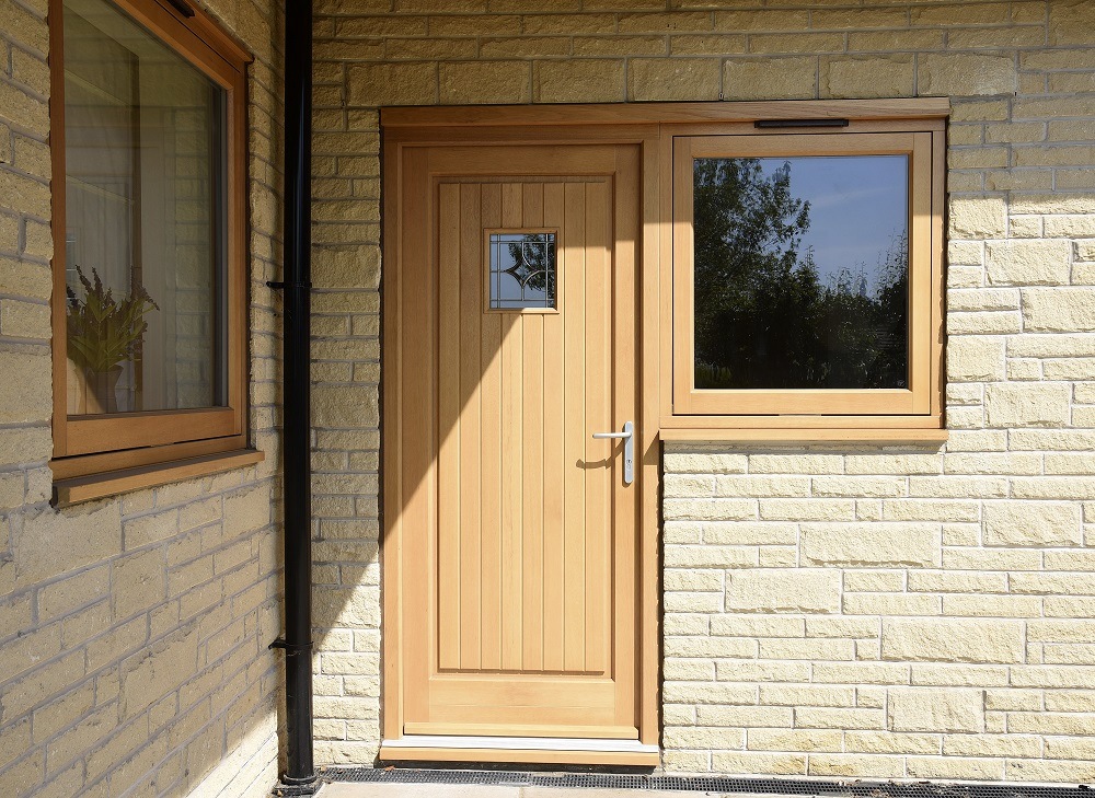 Sliding patio doors, flush casements and a Staverton entrance door were all specified in Engineered Meranti Hardwood finished in a Light Oak stain with Brushed Metal hardware.
