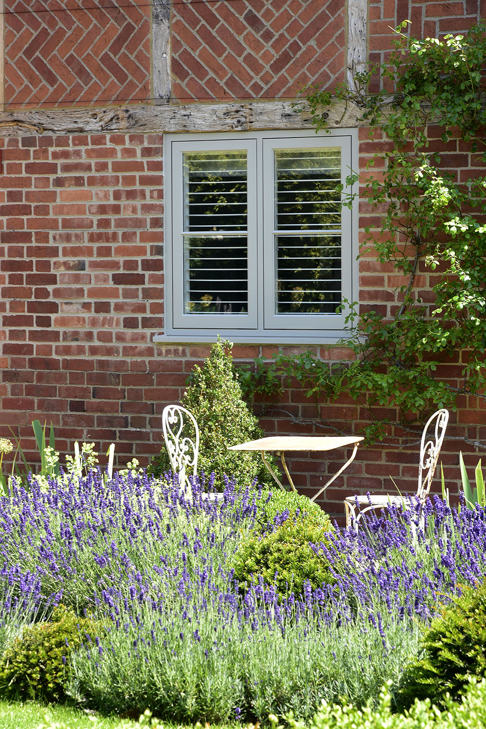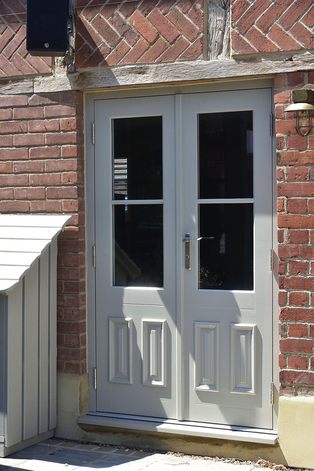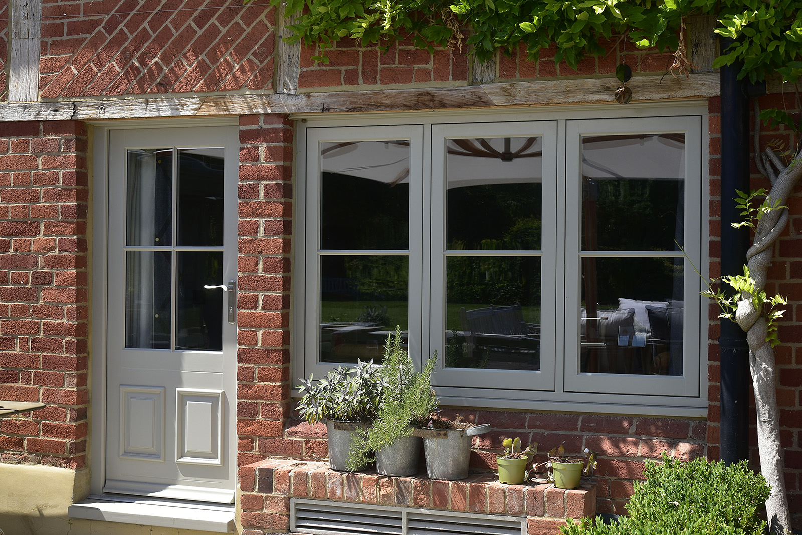 Flush casement windows were selected throughout, from our Listed range, finished in colours complementary to Farrow & Ball ‘Hardwick White’ externally and ‘Ammonite’ internally, along with a set of French doors and a single entrance door.