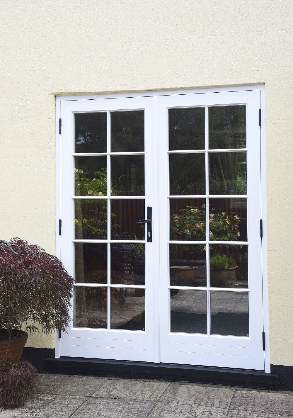 Cottage casement windows with their floating mullion and slimmer frames were chosen, finished in ‘White’ externally and ‘Dorset Cream’ internally with 18mm astragal glazing bars and manufactured in Engineered Meranti Hardwood. A matching set of French doors with Antique Black handle were also fitted.