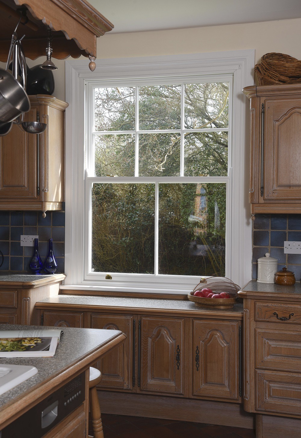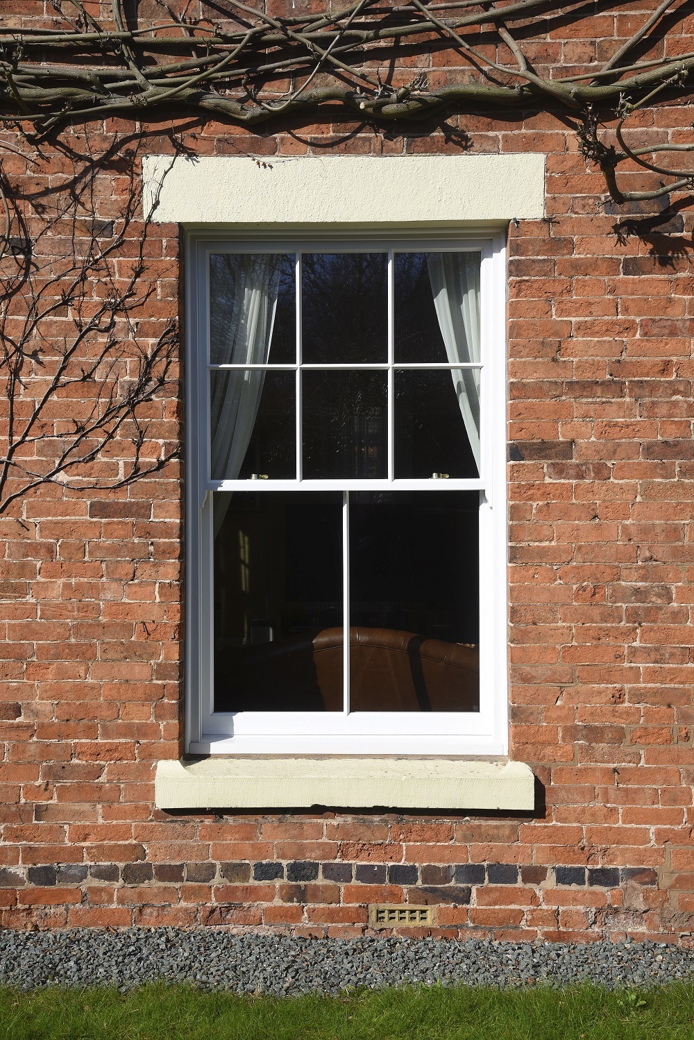 Slim sash window in ‘White’ with 18mm astragal glazing bars and Brass ironmongery, manufactured in Engineered European Redwood.