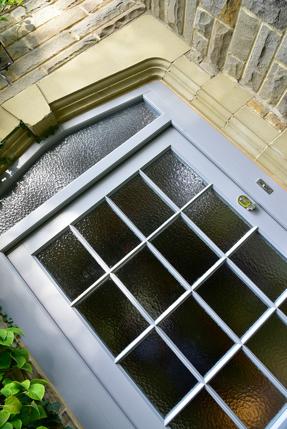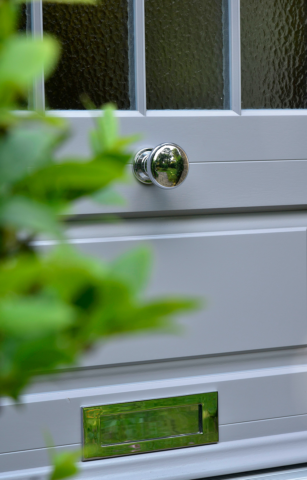 By lowering the middle rail, the lower panel has become shorter and wider, thus distorting the proportions and giving an appearance of greater width. The addition of elegant glazing bars to the now expanded glazing area further accentuates this. Finally, the placement of the door knob and letter plate provide the finishing touches.