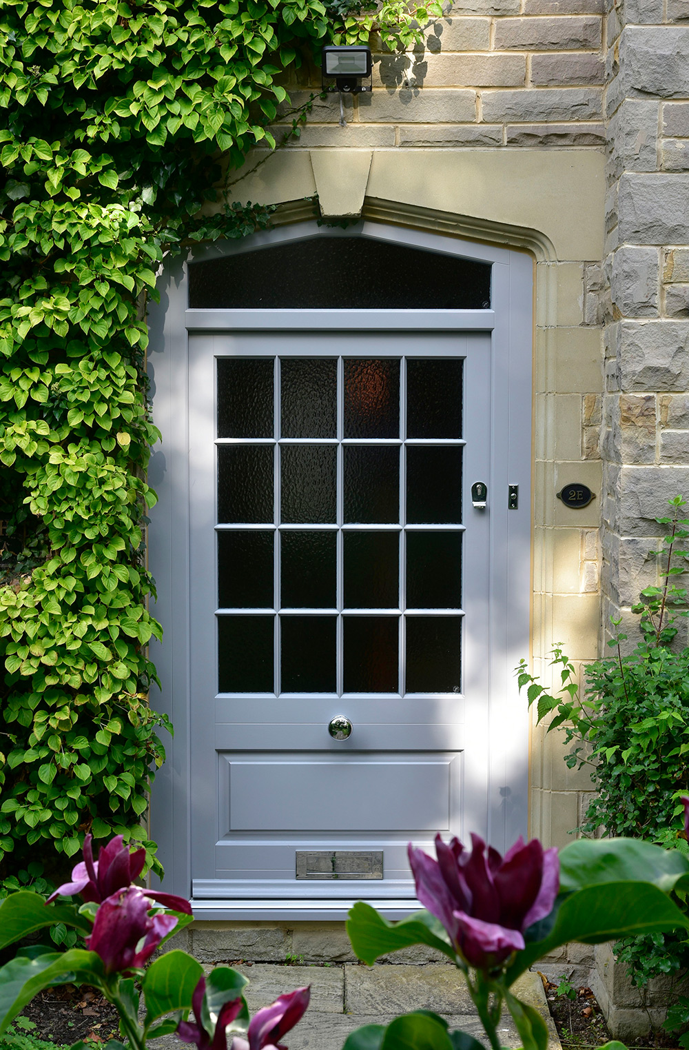 Custom Bardwell door in ‘Anodised Grey’ featuring a Chrome Profile door knob, Medium sized letter plate and escutcheon from Samuel Heath. The door also features 18mm astragal glazing bars and ‘Kathedral’ patterned glass to the door and toplight. Manufactured in Engineered Meranti Hardwood.