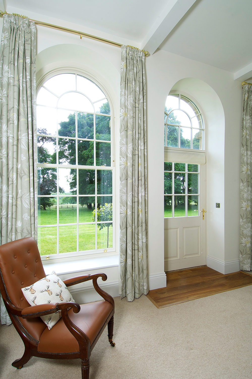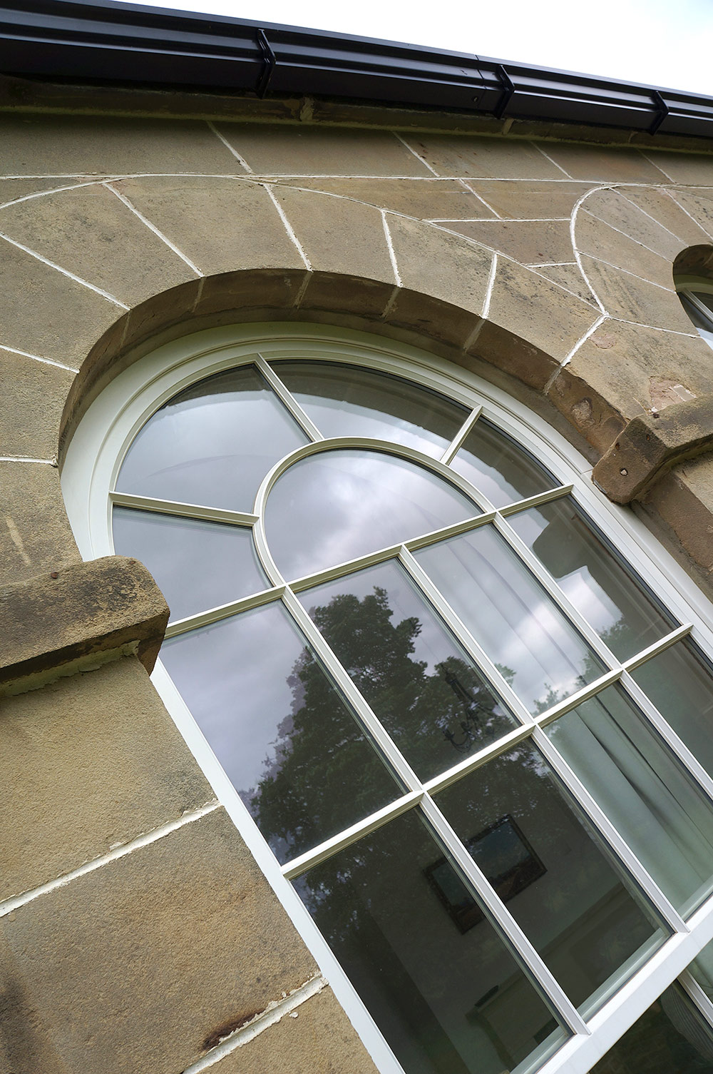 Large arched sash windows finished in 'Cream' with 18mm astragal glazing bars. Manufactured in Engineered European Redwood.