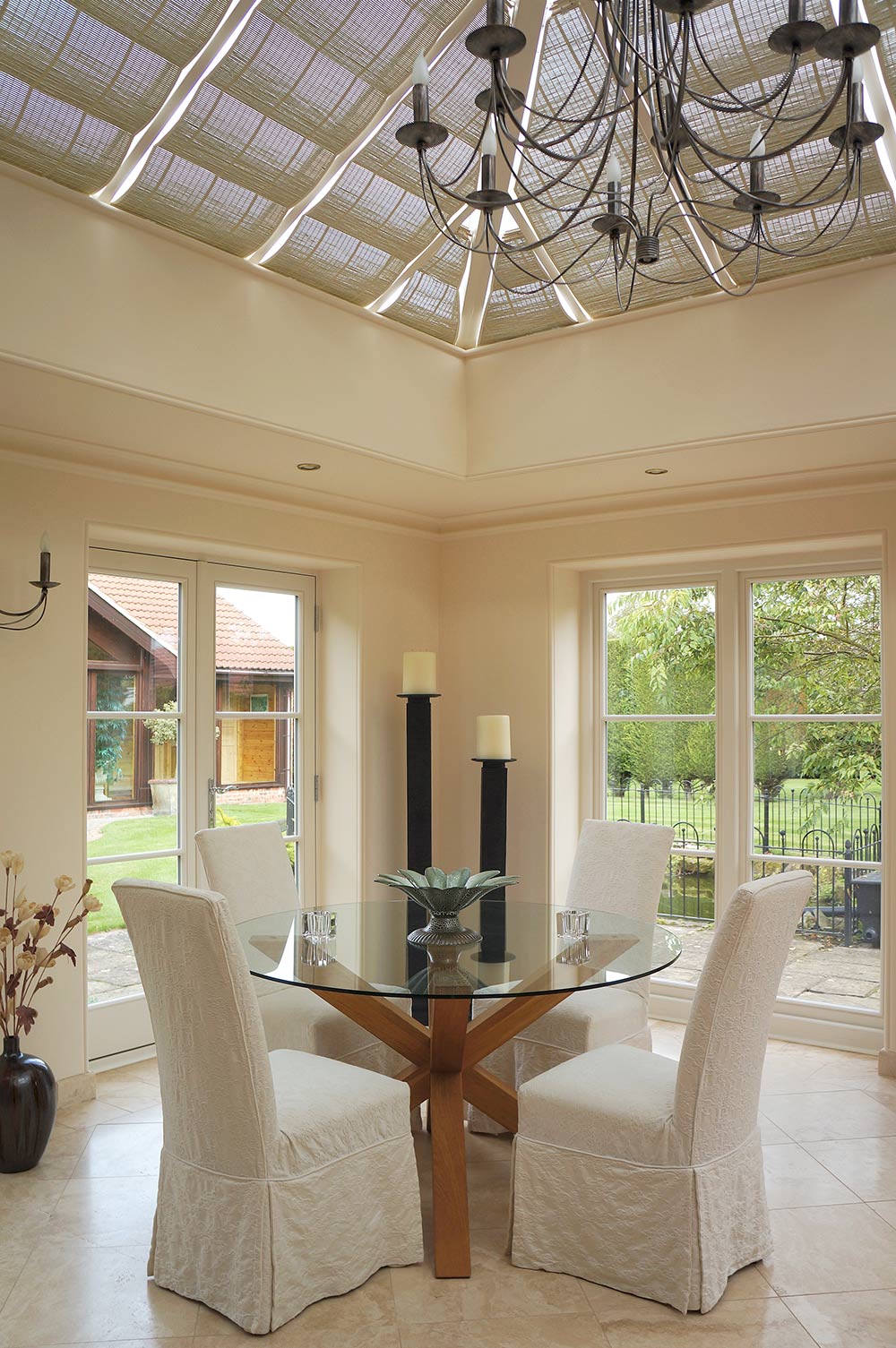 Light and airy lounge area with large, fixed flush casement windows finished in 'Cream' with 27mm astragal glazing bars.