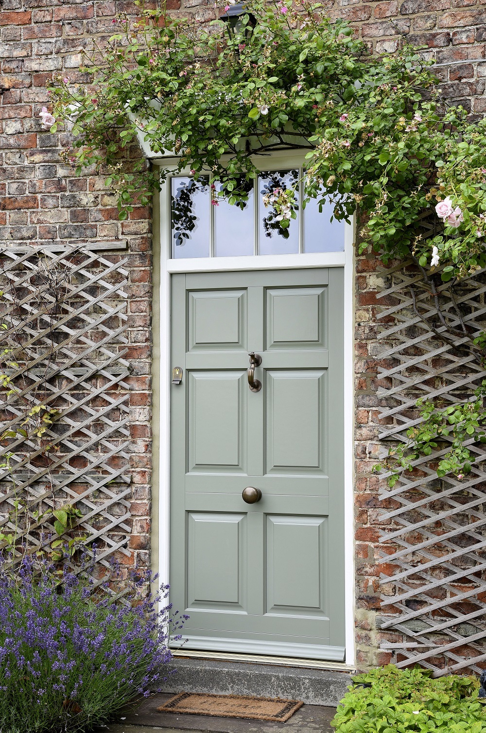 Chadlington entrance door and toplight in Tent Grey, with 18mm astragal glazing bars. Antique Brass Unlacquered ironmongery by Samuel Heath.