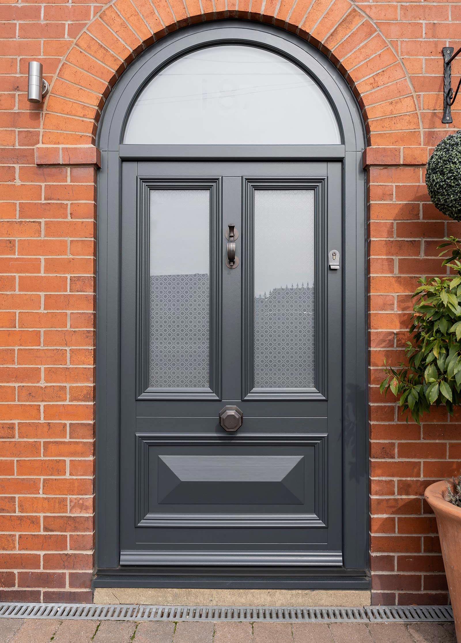 Westonbirt style entrance door with arched toplight finished in ‘Anthracite’. Featuring ‘Etched Sun’ patterned glass to the door sash and ‘Sandblasted’ glass with etched house number to the toplight. Ironmongery options selected as a Bronze Doctor’s knocker and escutcheon from Samuel Heath.