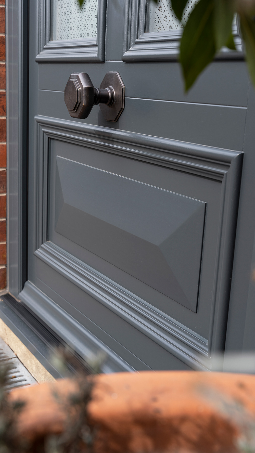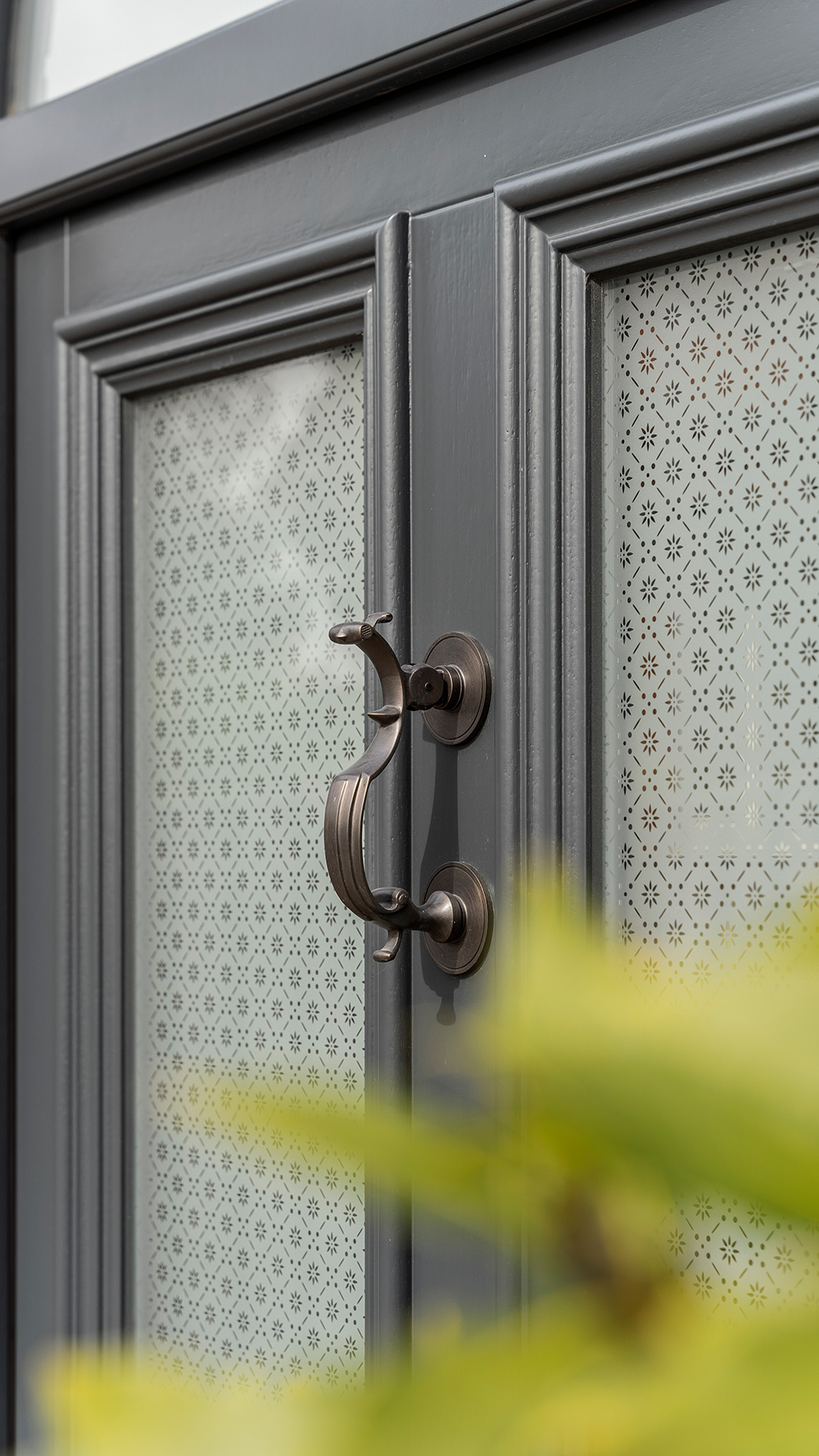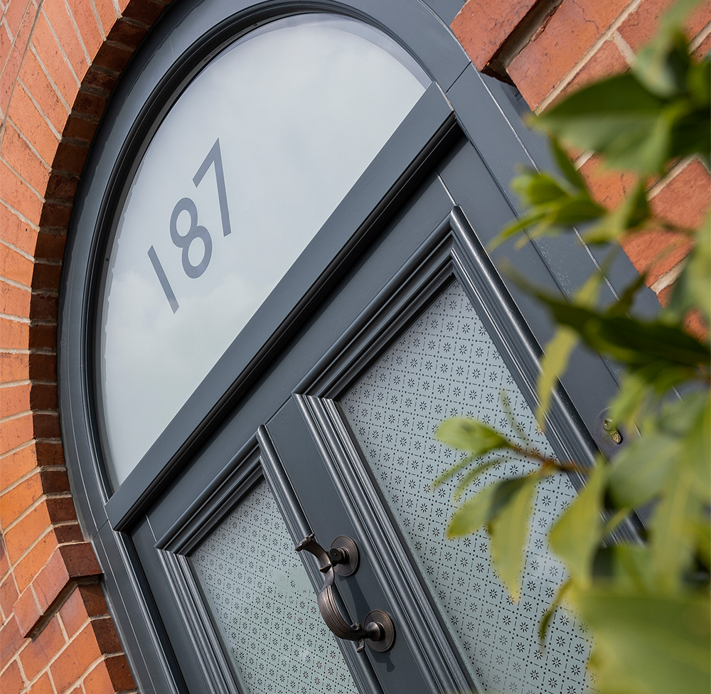 Westonbirt style entrance door with arched toplight finished in ‘Anthracite’. Featuring ‘Etched Sun’ patterned glass to the door sash and ‘Sandblasted’ glass with etched house number to the toplight. Ironmongery options selected as a Bronze Doctor’s knocker and escutcheon from Samuel Heath.