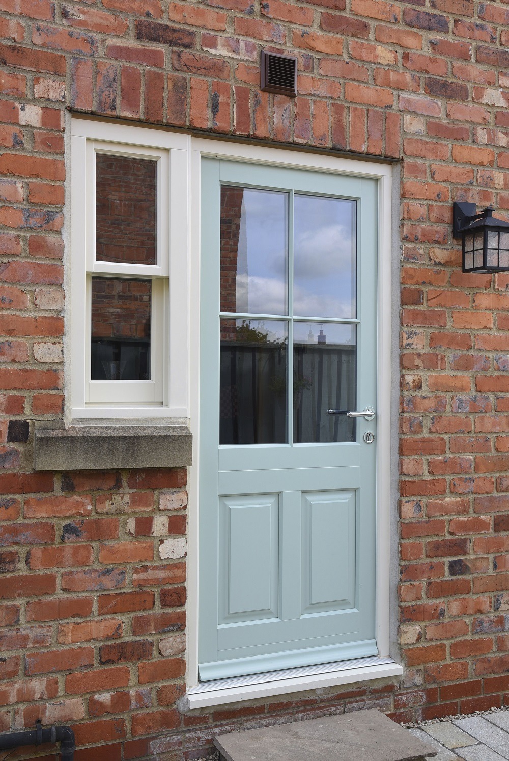 Belbroughton entrance door in a colour complementary to Farrow & Ball ‘Green Blue’ featuring a Chrome Profile handle from Samuel Heath and 18mm astragal glazing bars, with accompanying sash window in the shade of ‘Straw’.