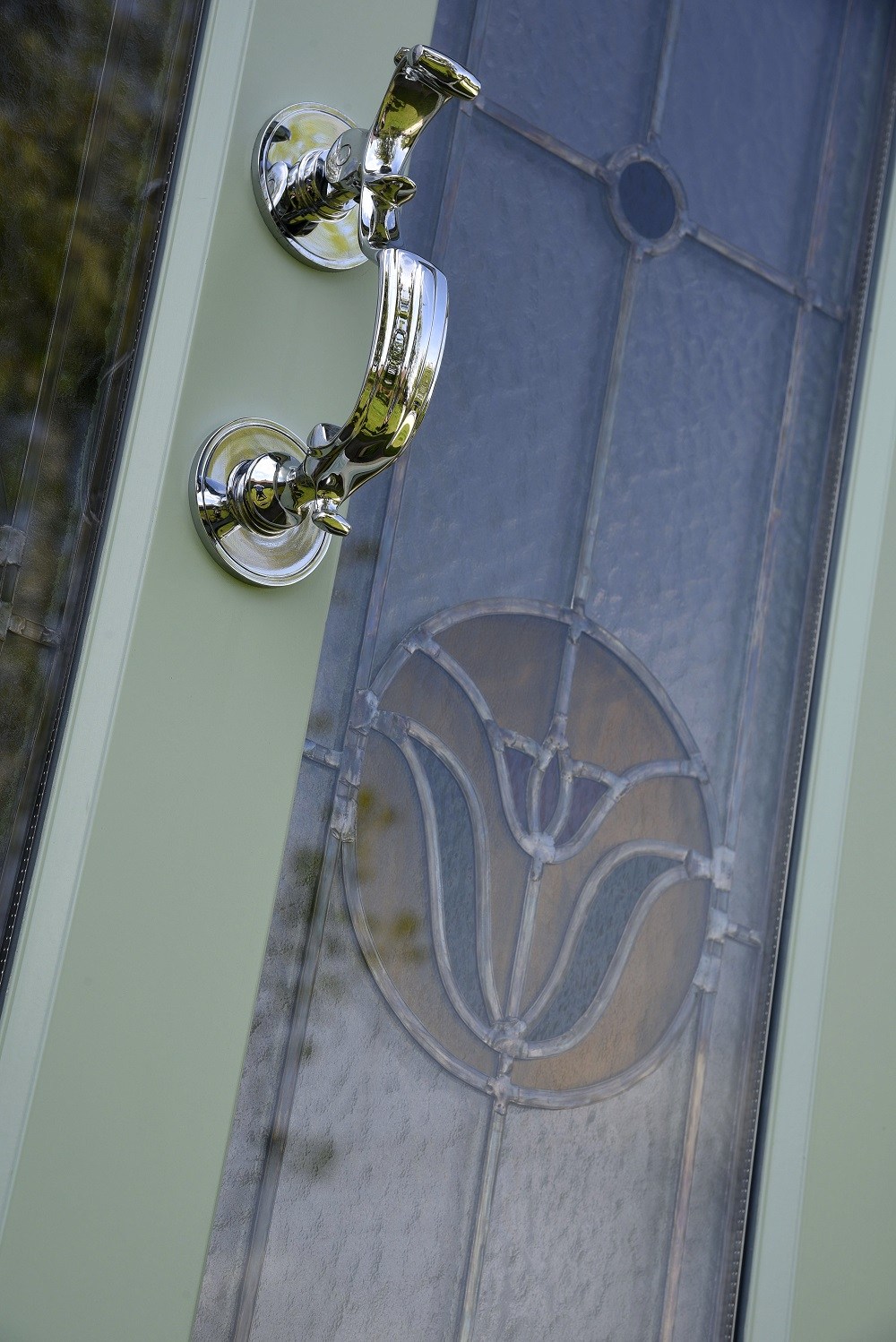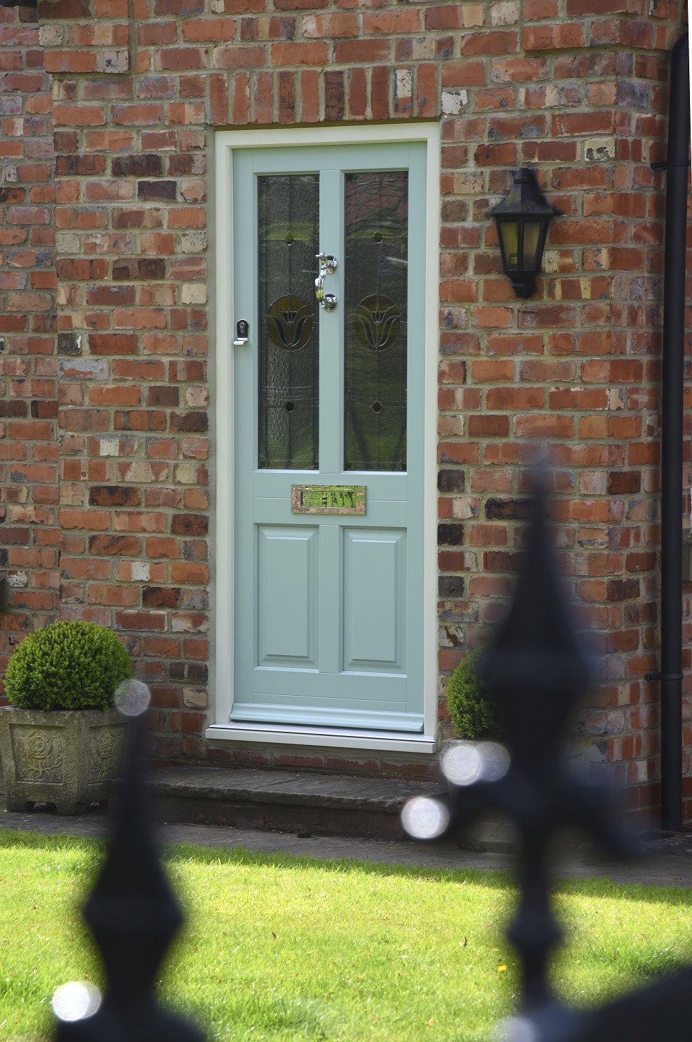 Kingston entrance door in a colour complementary to Farrow & Ball ‘Green Blue’ featuring Signature Bloom decorative glazing on Kathedral patterned glass along with a Chrome Doctor’s knocker.