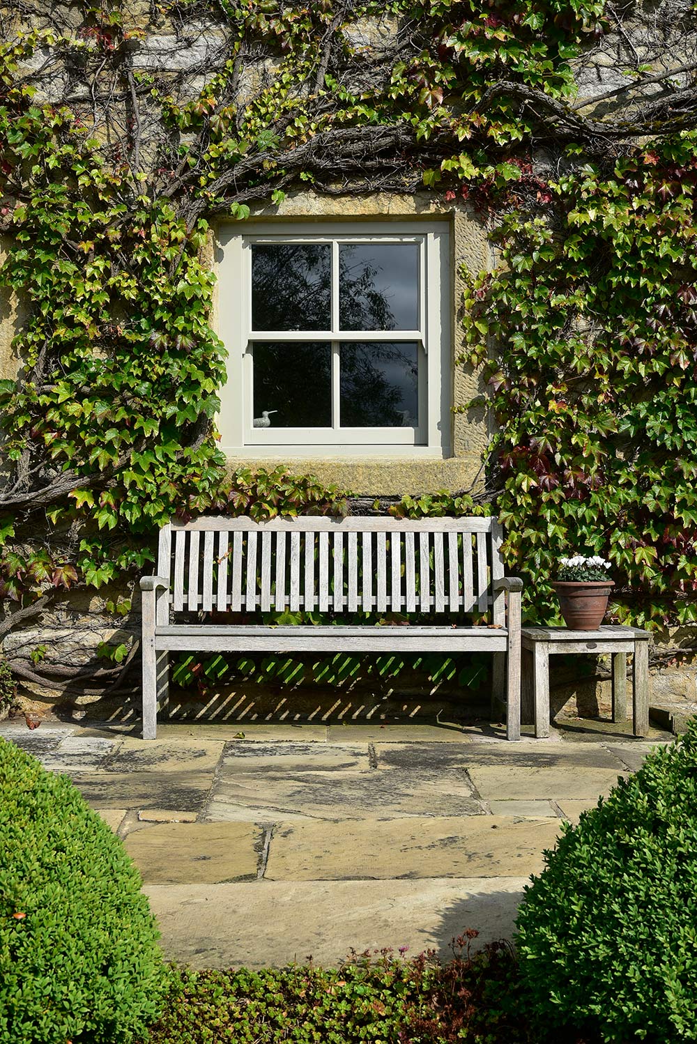 Slim sash windows finished in a colour complementary to Farrow & Ball ‘Hardwick White’ with decorative sash horns and 36mm astragal glazing bars. Manufactured in Engineered Meranti Hardwood.