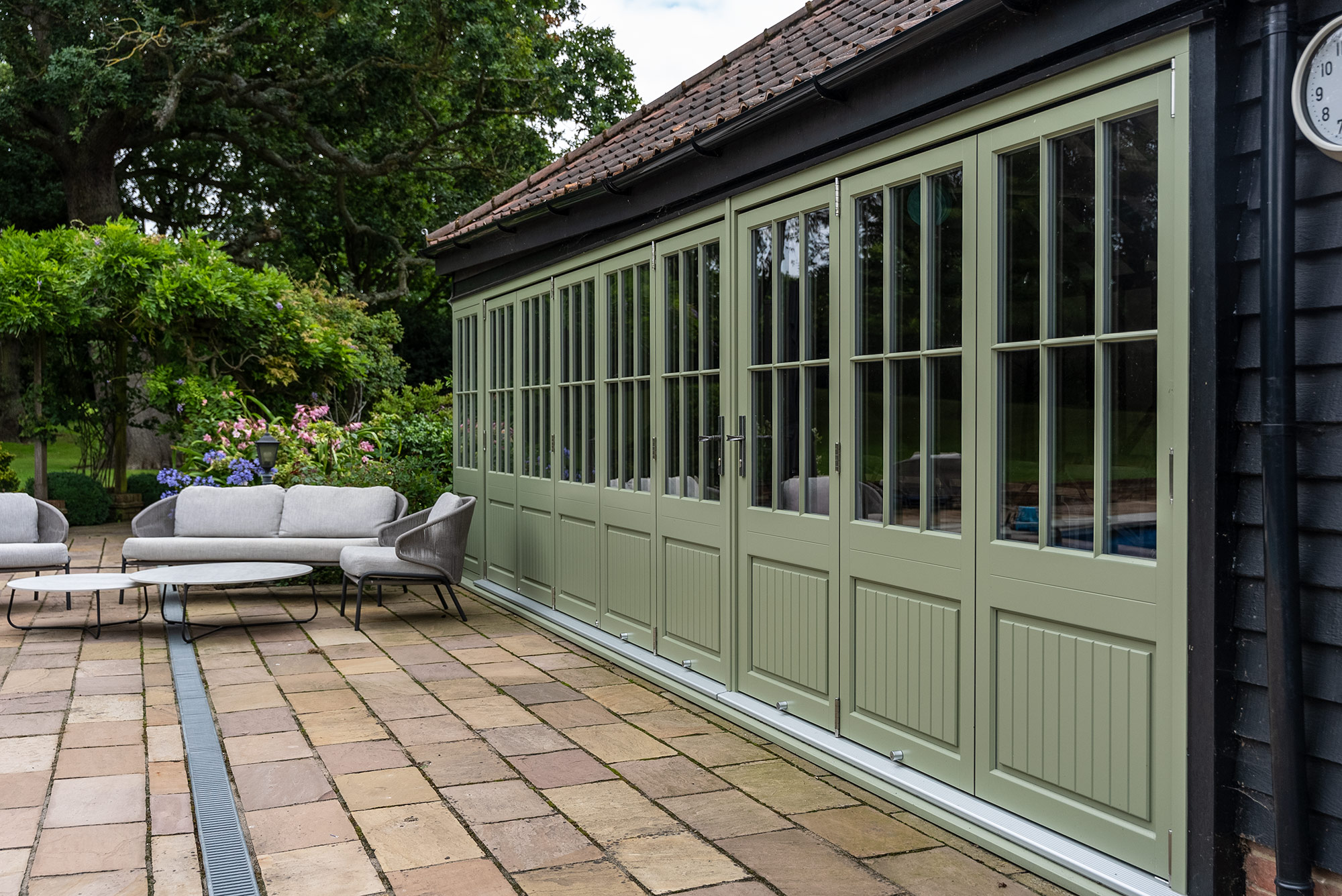 Bi-fold doors finished in a colour complementary to Farrow & Ball 'Lichen', with 18mm astragal glazing bars and a Pewter Cottage handle. Manufactured in Engineered European Redwood.