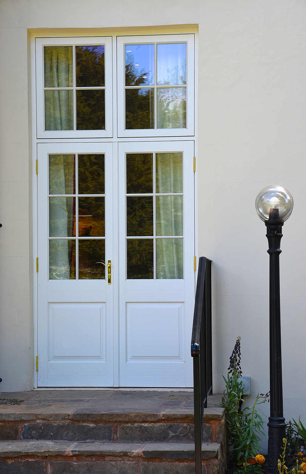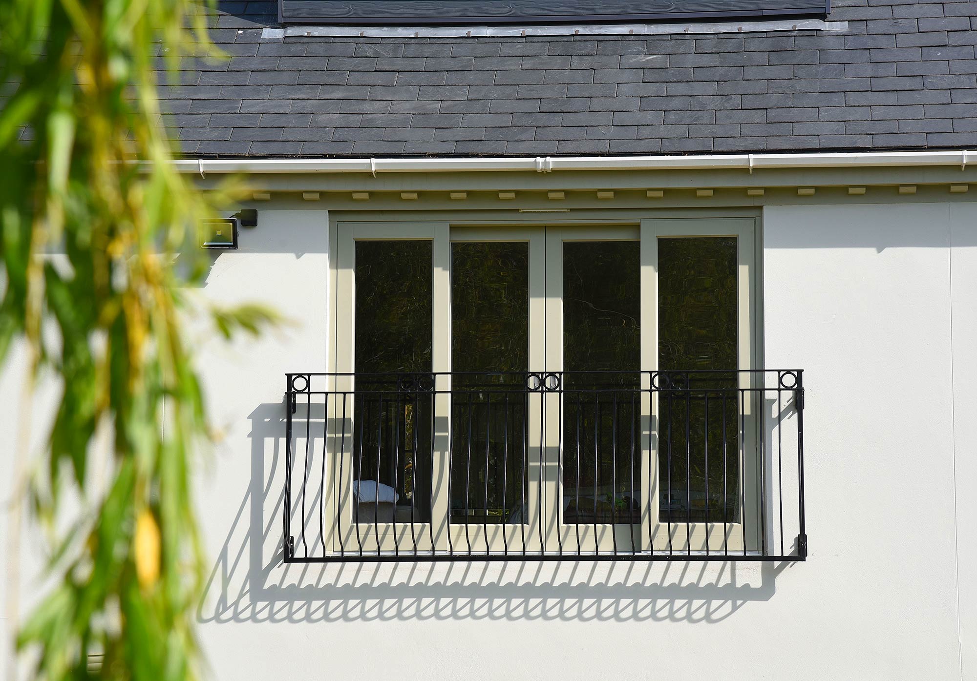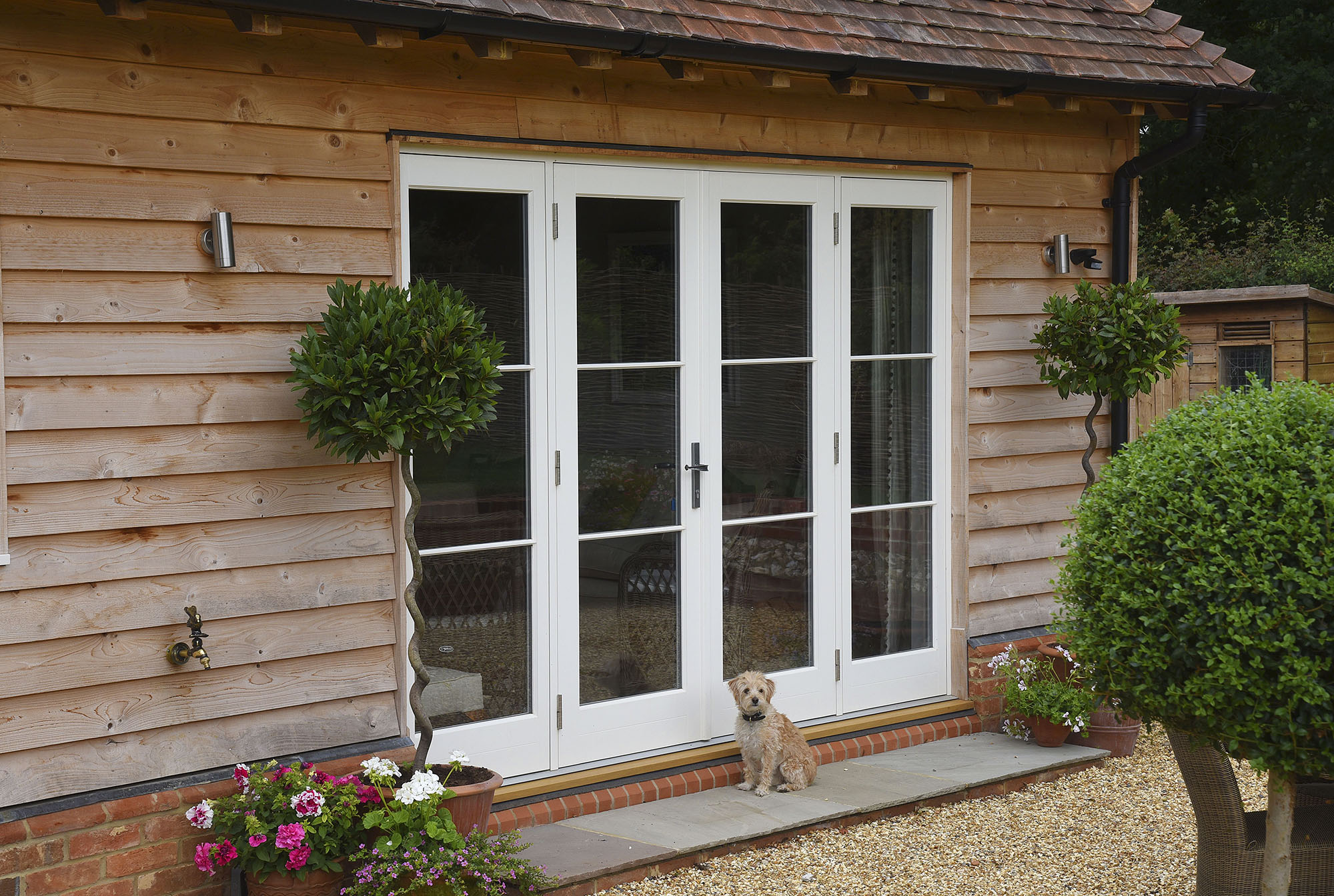 French doors with sidelights finished in a colour complementary to Farrow & Ball ‘Farrow’s Cream’ with 18mm astragal glazing bars and manufactured in Engineered European Redwood. Also featuring Henry the cat!