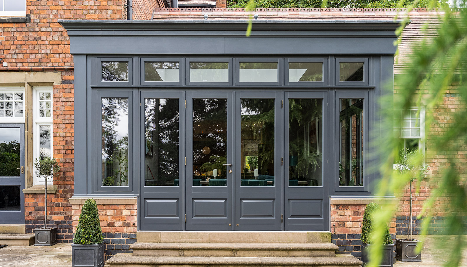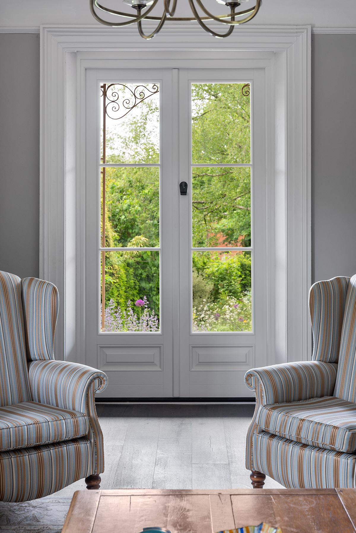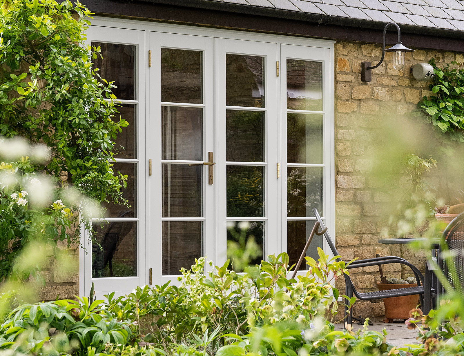 French doors and flush casement windows finished in a colour complementary to Farrow & Ball 'French Grey', with a Polished Brass Newbury handle. Manufactured in Engineered Meranti Hardwood.
