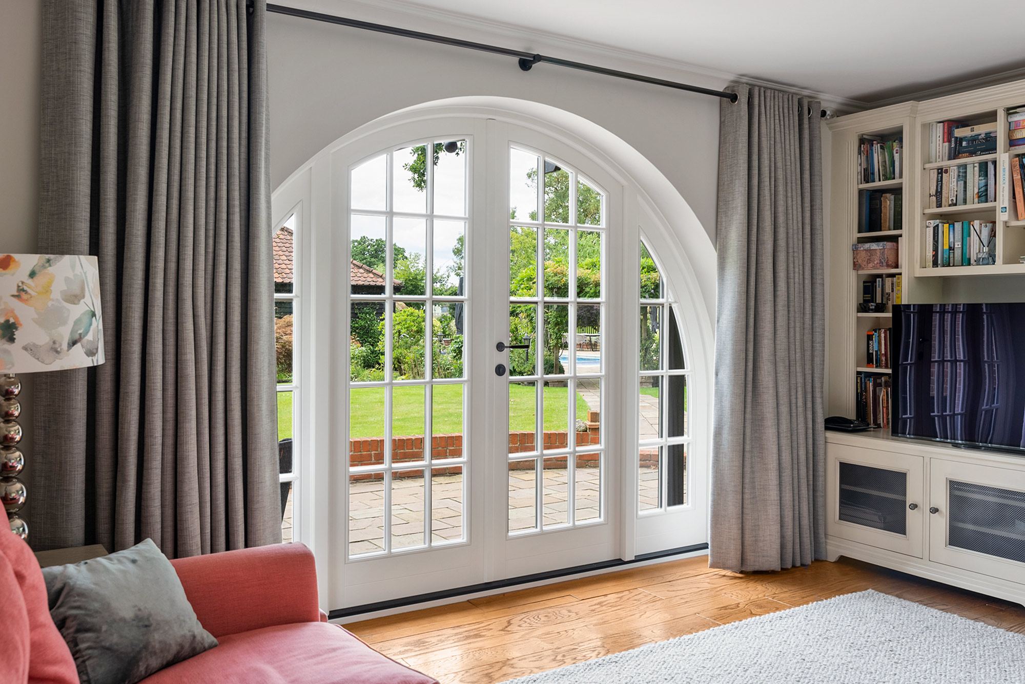 Bespoke, arched French doors finished in a colour complementary to Farrow & Ball 'Middleton Pink', with 18mm astrgal glazing bars and an Antique Brass Unlacquered Samuel Heath Profile Shoulder handle.