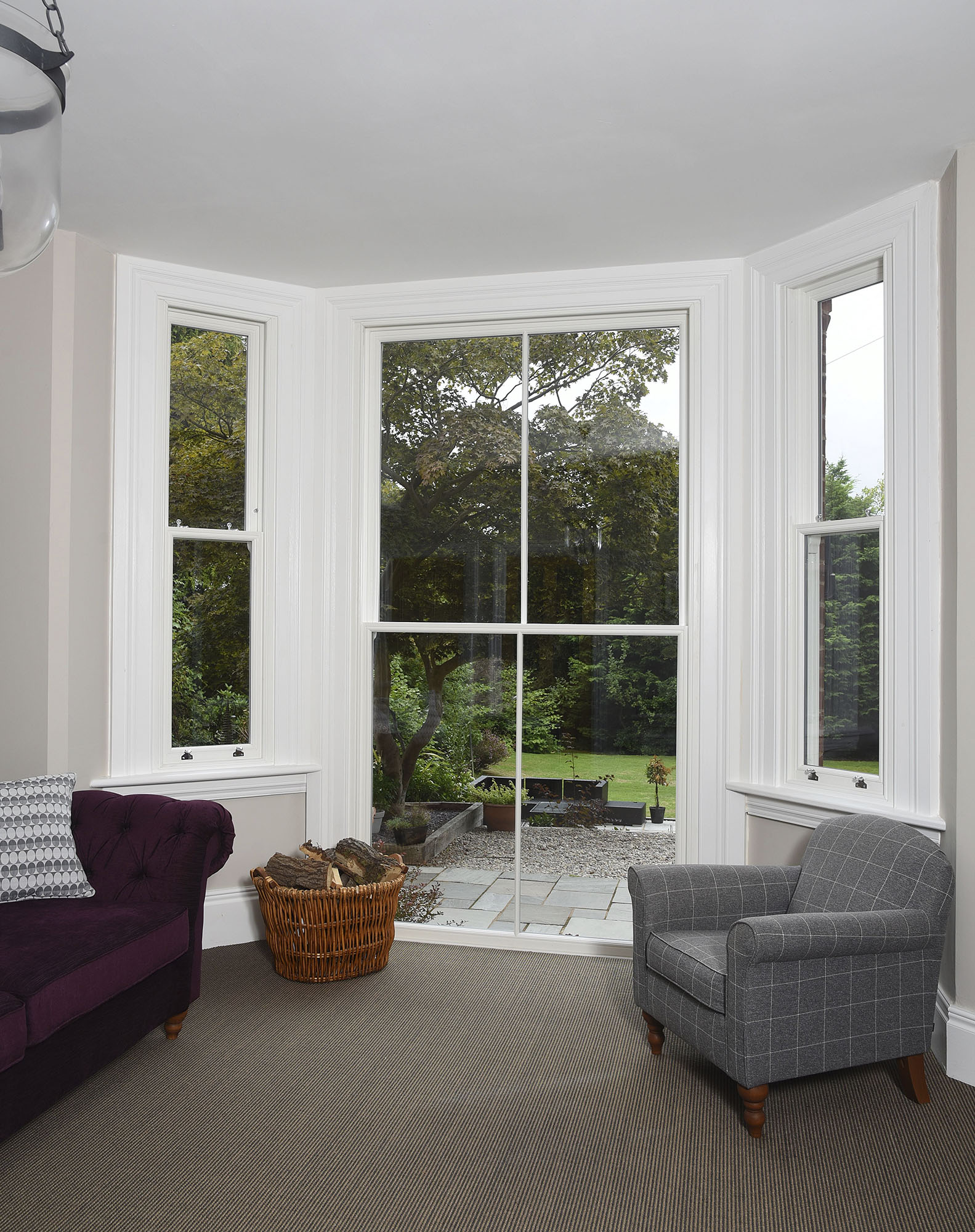 Sash windows in ‘White’ hung on traditional chains and weights, featuring 18mm astragal glazing bars and manufactured in Engineered European Redwood.