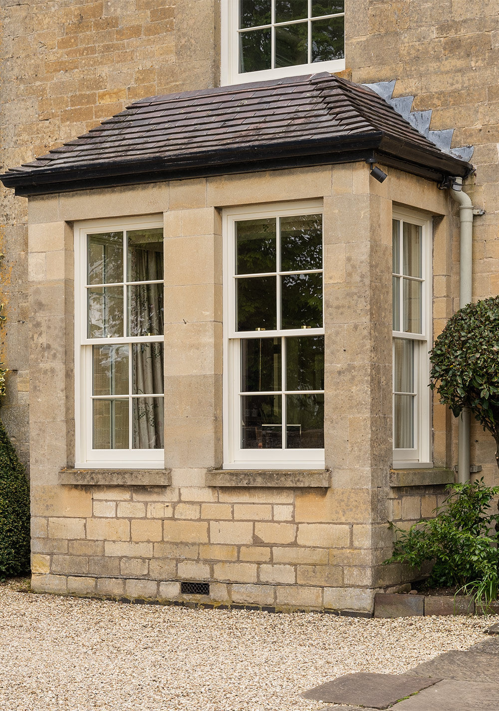 Slim sash bay windows finished in 'Smoke Cream', with 18mm astragal glazing bars and Traditional sash horns. Manufactured in Engineered European Redwood.