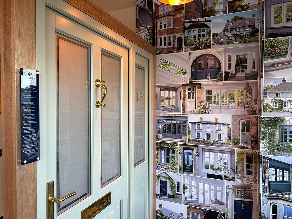 As you walk through our showroom, you will find further examples of our range of engineered timber windows and doors, including our Westonbirt style door with a bespoke, etched glass toplight. Our door range allows you to include the name or number of your property within the toplight, making it easier to be found by guests, and adding further character to your home.