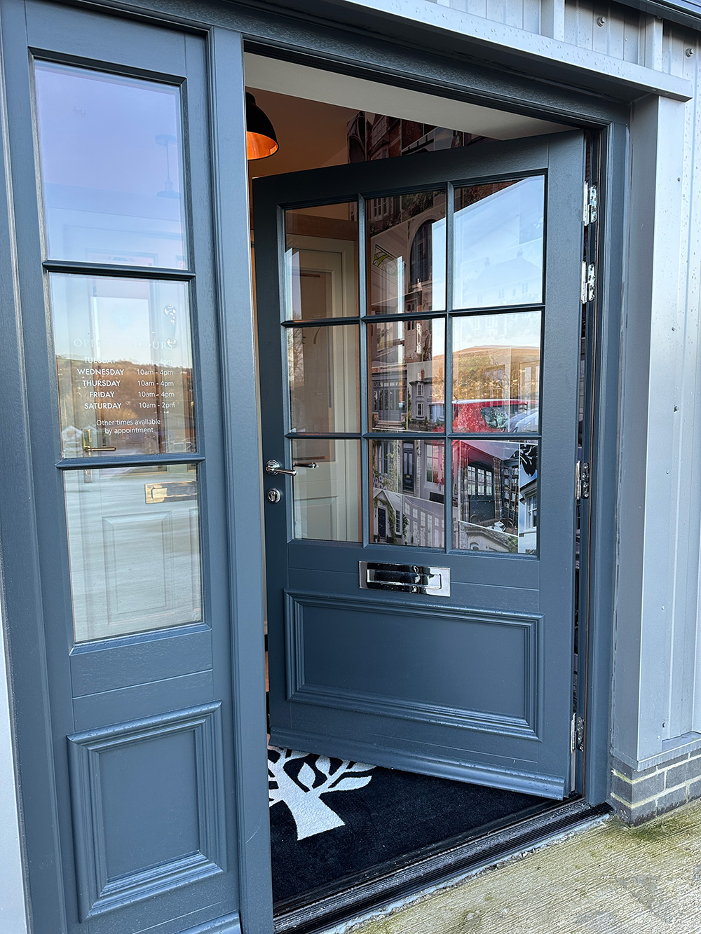 Upon entering the showroom, you will find a beautiful example of our Kingston style front door with a sidelight. The door is finished in one of our most popular shades, ‘French Grey’. Partnered with Polished Brass (Unlacquered) door hardware, this colour and style combination creates a timeless look that we have seen boost the kerb appeal and beauty of many homes across the country.