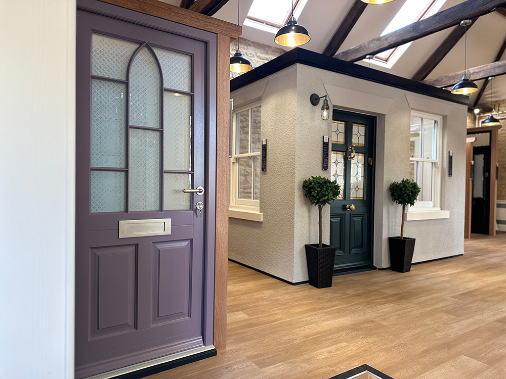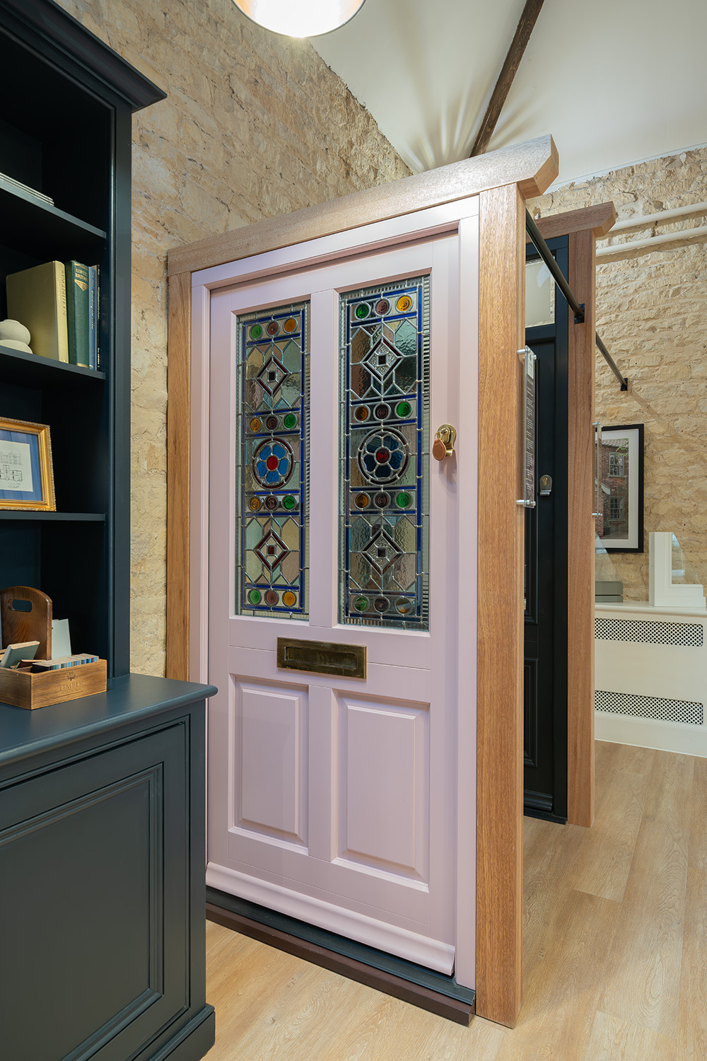 As you walk through our showroom, you will find multiple examples of our range of engineered timber windows and doors, including our beautiful and timeless Kingston style front door, in the eye-catching shade of ‘Blossom’ with a stunning, bespoke stained glass pattern; a way to add further character and charm to your new front door.