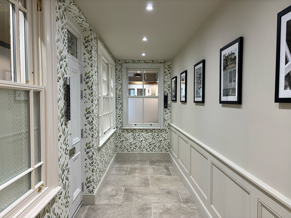 As you walk through our showroom, you will find multiple examples of our range of engineered timber windows and doors, including a stunning example of our Bevington style front door with a toplight, displaying beautiful, Kelmscott style glass and our traditional bolection mouldings; a way to add further character and charm to your new front door, and typical of Art Deco style.