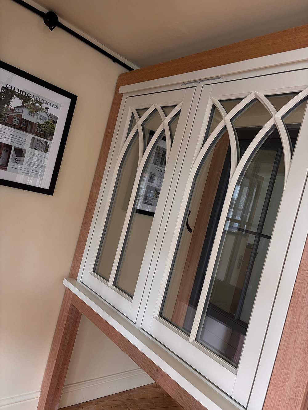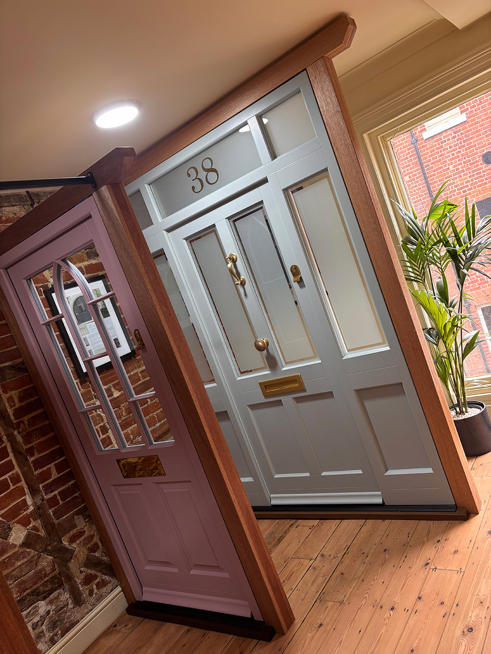 As you walk upstairs in our showroom, you will find multiple examples of our range of engineered timber windows and doors, including a wonderful example of our Moorbank style front door finished in the charming shade of ‘Blossom’, with 316 Coastal Grade Polished Brass ironmongery. This style and colour combination is a popular choice among homeowners, and adds character as well as beauty.