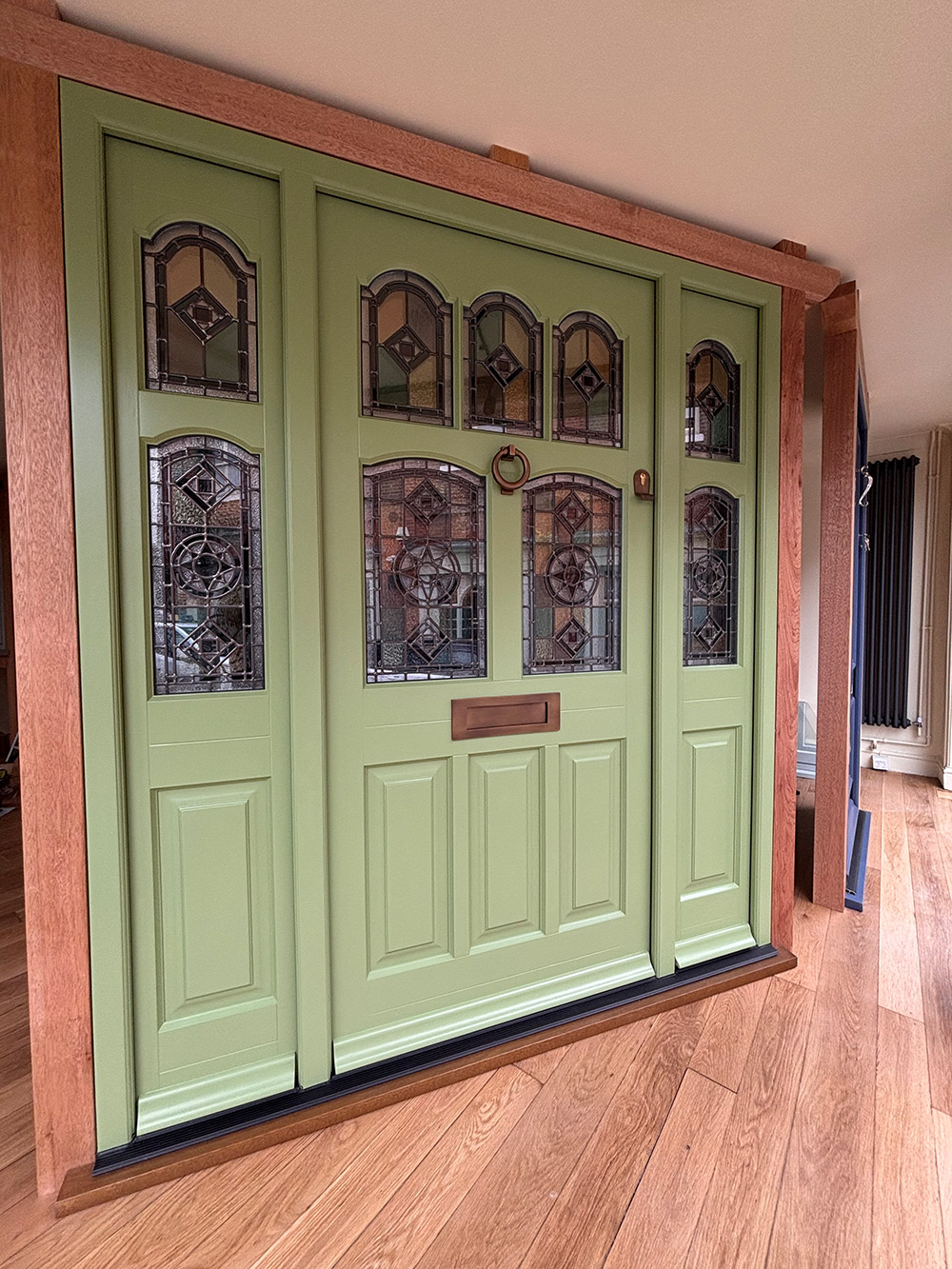 Upon entering the showroom, you will find a stunning example of our Winterbourne style front door with sidelights. The door is finished in a colour complementary to Farrow & Ball ‘Yeabridge Green’ externally, and is partnered with a beautiful, bespoke stained-glass design and Antique Brass Unlacquered hardware. This wonderful front door would boost the functionality, kerb appeal and beauty of any home.